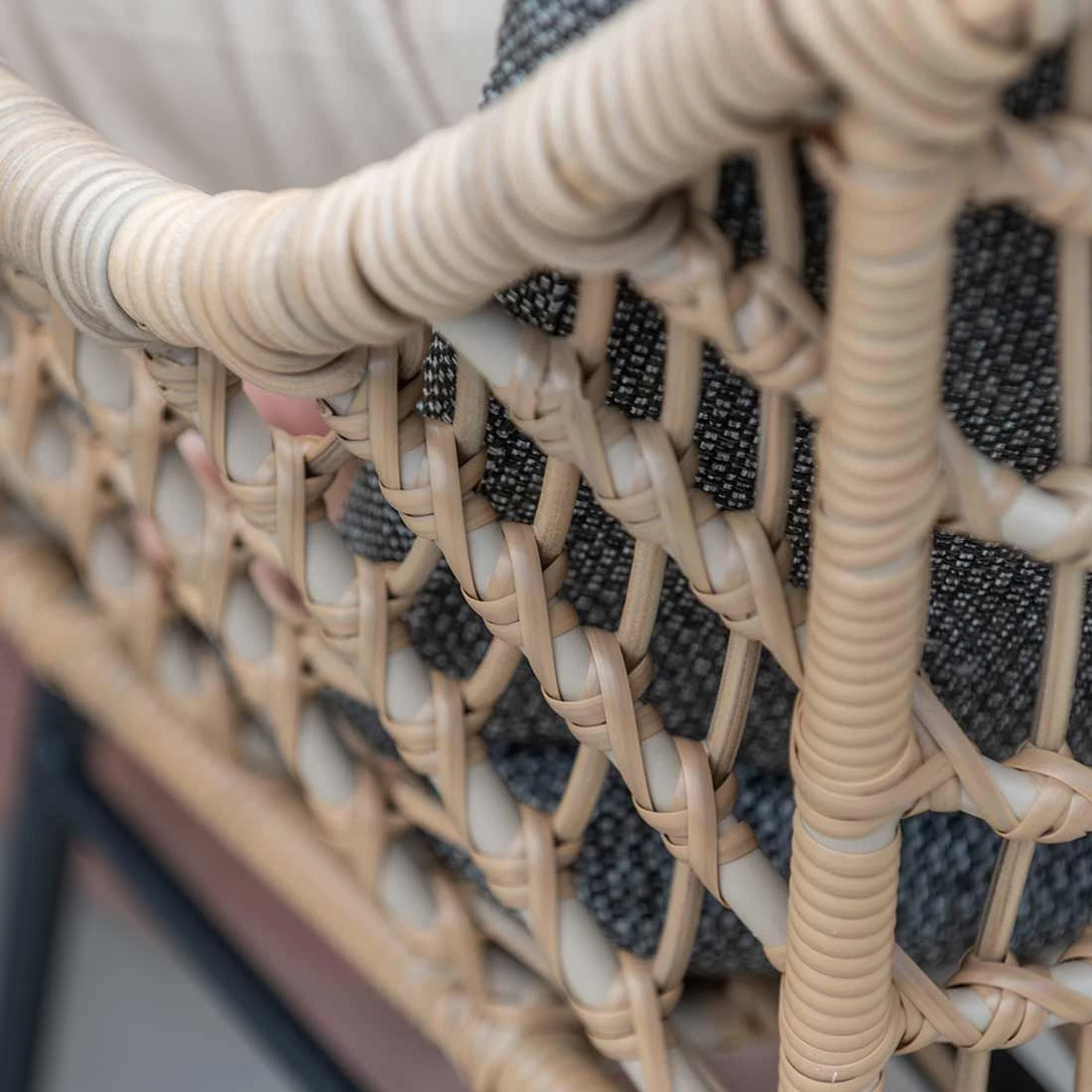 Das Gestell wird aus hochwertigem und rostfreiem Edelstahl hergestellt. Aufgrund des etwas höheren Eigengewichts, steht der Gartensessel dadurch besonders stabil und windsicher auf der Terrasse. Für eine attraktive Optik ist das Gestell im Farbton Anthrazit gehalten. Die Sitzfläche des Gartensessels besteht aus qualitativ hochwertigem Polyrattan. Ein Material, das sich durch seine lange Haltbarkeit auszeichnet. Die Sitzfläche ist in ansprechendem Sand gehalten. Für die Bezüge wird Olefin verwendet. Der Marken-Outdoorstoff überzeugt mit einer hohen Witterungsbeständigkeit. Denn sowohl Sonne als auch Regen können dem robusten Outdoor-Stoff kaum etwas anhaben. Farblich begeistert der Bezug in elegantem Grau-Meliert.