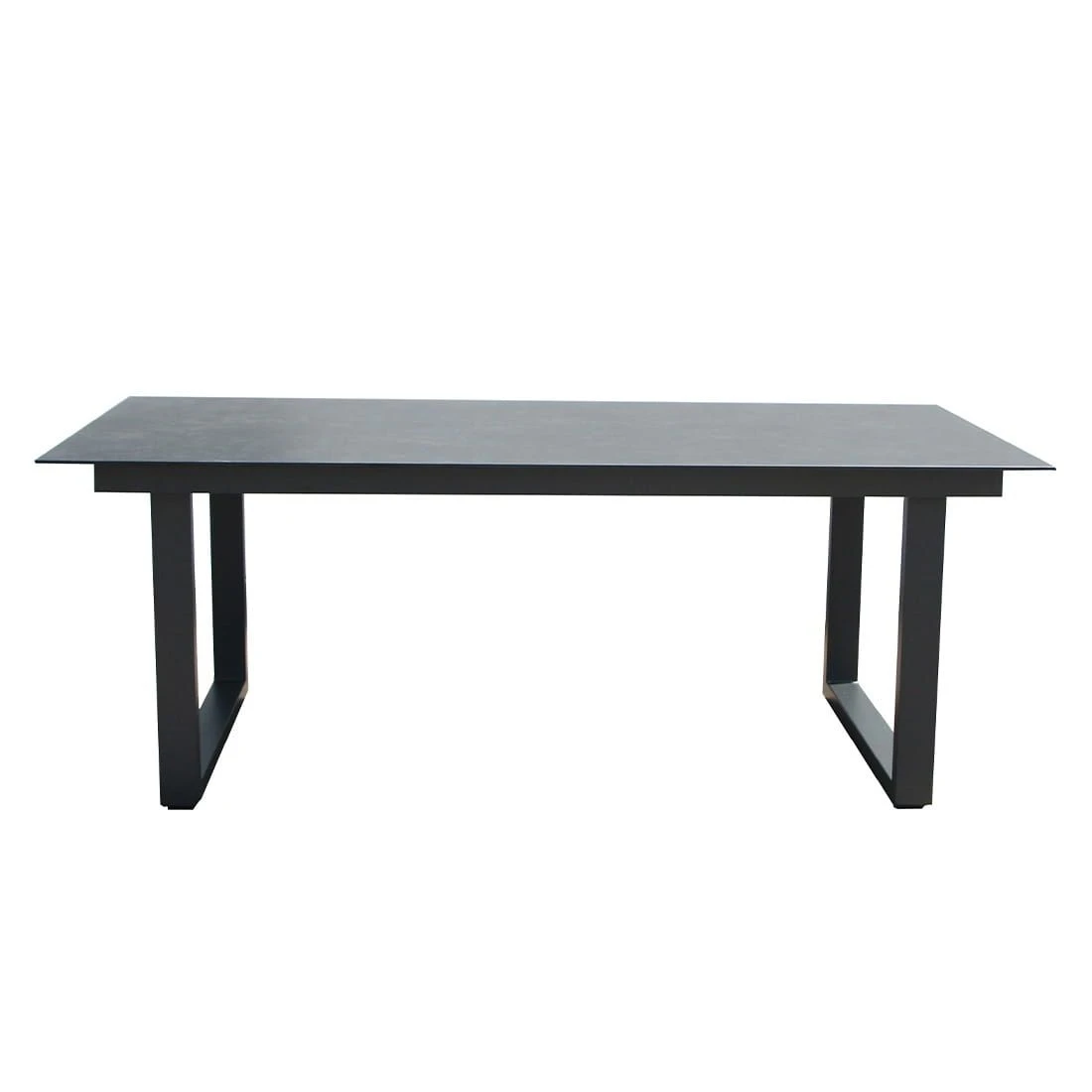 Aufgrund seines Gestells aus Aluminium zählt der Gartentisch Hollywood zu den modernen Tischmodellen, die sich im Garten ganz einfach aufstellen und bewegen lassen. Optisch ist das Gestell in Anthrazit gehalten. Für die Herstellung der Tischplatte wird robustes Glas verwendet. Farblich ist die Platte in Cemento Anthrazit gehalten. Das Gestell besticht mit seinen attraktiven Kufen. Mit der rechteckigen Form lässt sich der Gartentisch platzsparend in Ecken oder an Häuserwänden aufstellen.