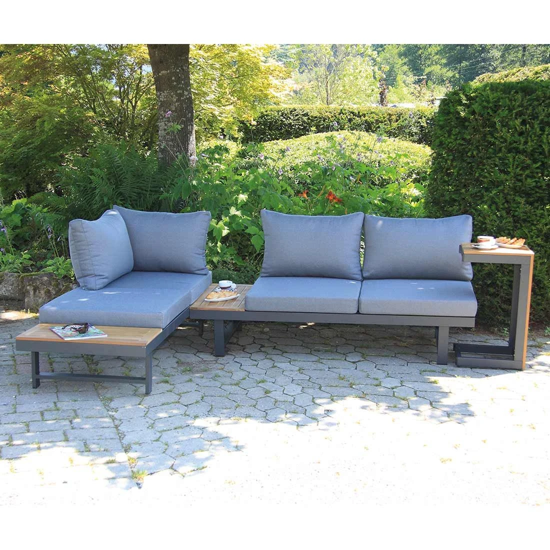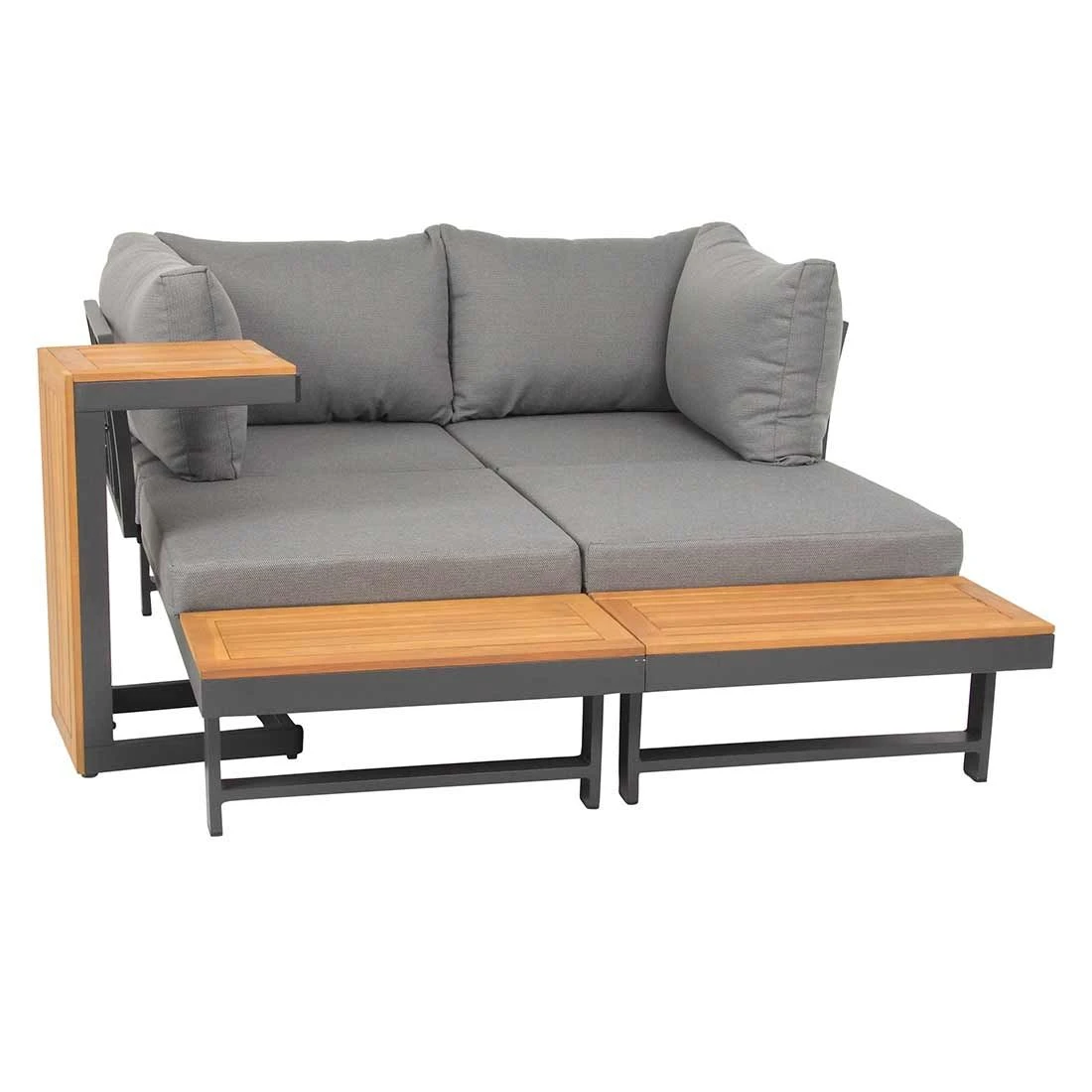 Das Gestell ist aus Aluminium gefertigt. Optisch begeistert das Gestell in der Farbe Anthrazit. Der Bezug der Ecklounge ist aus Kunstfaser gefertigt. Auch wenn der Bezugsstoff Wind und Wetter trotzen kann, empfehlen wir, abnehmbare Kissen bei länger andauernder Feuchtigkeit und im Winter drinnen zu lagern. Die Farbe des Bezugs ist Grau. Die Platte des Tisches wurde aus wertigem Akazienholz gefertigt und erzeugt dadurch ein natürliches Ambiente. Farblich überzeugt die Tischplatte in Teaklook.