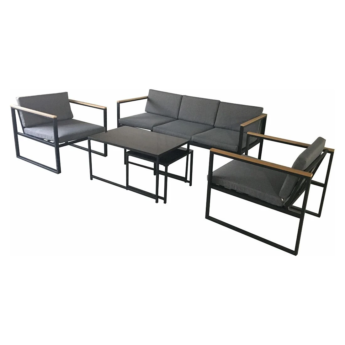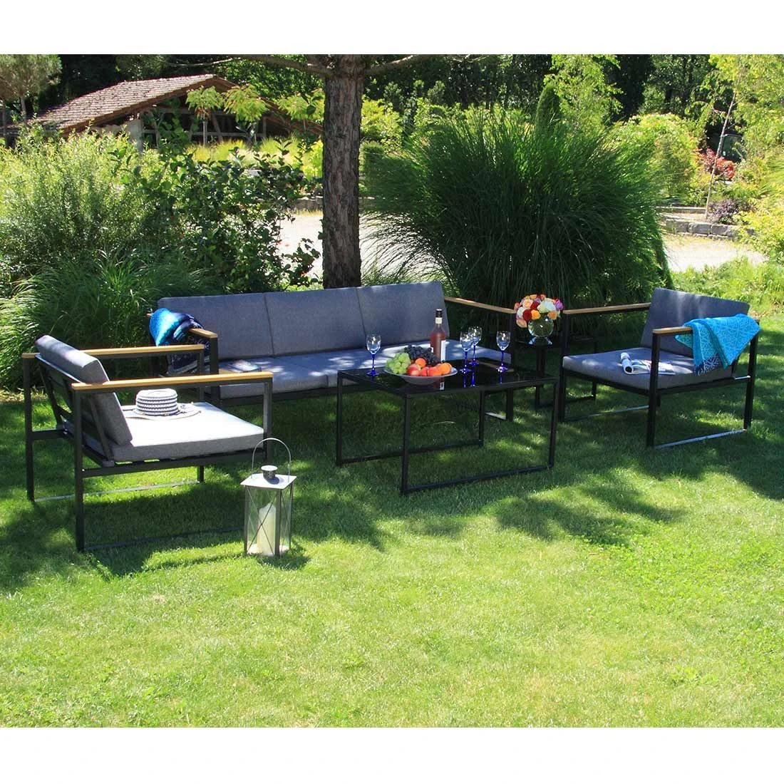 Damit das Loungeset optisch ansprechend ist, sind das Gestell und die Sitzfläche im Farbton Anthrazit gehalten. Die Sitzflächen werden aus Polyester gefertigt. Auch wenn diese Wind und Wetter trotzen, empfehlen wir die abnehmbaren Kissen bei länger andauernder Feuchtigkeit drinnen zu lagern. Die Farbe des Bezugs ist Grau. Die Tischplatte wird aus robustem Glas gefertigt. Passend zum Gesamtbild des Loungesets begeistert die Tischplatte mit ihrer Farbgebung in Schwarz.
