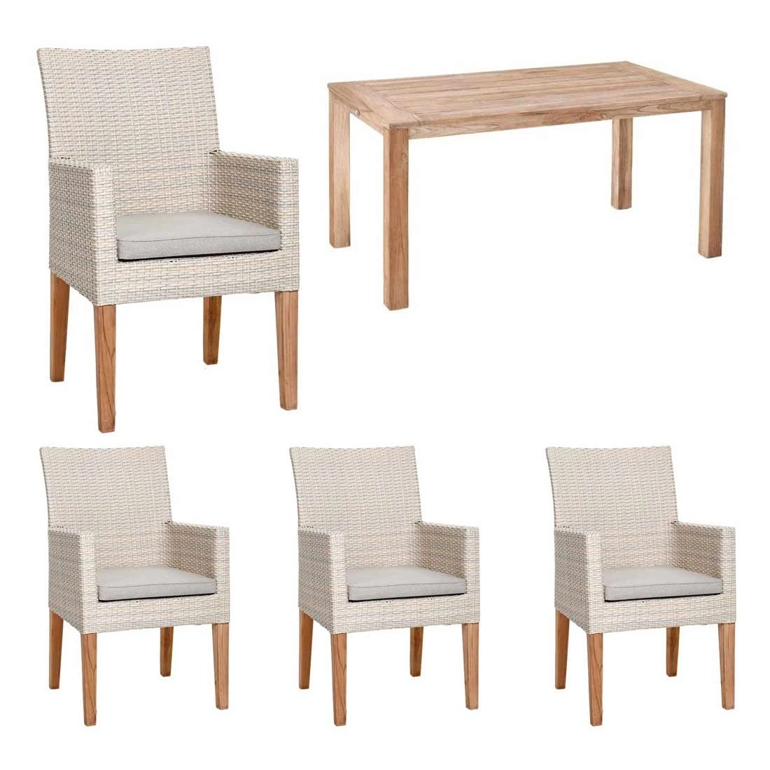 Um das robuste Gestell wird ein witterungsbeständiges Geflecht aus Polyrattan geflochten. Sowohl der Korpus als auch die Sitzflächen sind auch Polyrattan-Geflecht gefertigt und bilden so eine stimmige Einheit. Ton in Ton ist das Gartenmöbel-Set gehalten: Sowohl die Gestelle als auch die Tischplatte sind aus Teakholz gefertigt.