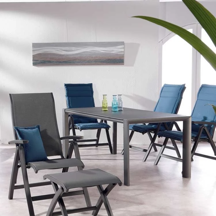 Das Gestell wird aus Aluminium gefertigt. Das geringe Eigengewicht des Materials macht den Klappsessel zu einem robusten, aber dennoch leicht zu transportierenden Sitzmöbel auf Ihrer Terrasse. Für eine attraktive Optik ist das Gestell im Farbton Anthrazit gehalten. Für die Bespannung der Sitzfläche verlässt sich der Hersteller auf hochwertiges Textilene. Es zeichnet sich durch eine hohe Robustheit gegenüber Hitze und Frost aus und ist leicht zu reinigen. Damit der Klappsessel optisch ansprechend ist, sind die Sitzfläche und der Bezug im Farbton Grau gehalten.