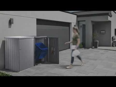 Gefertigt ist die Mülltonnenbox Variante 1 aus feuerverzinktem, polyamid-einbrennlackiertes Stahlblech in der Farbe Silber-Metallic. Die Schrauben und Scharniere bestehen aus Edelstahl. Im Lieferumfang der Box sind neben dem Auffangbügel und dem Funktionsboden zur optimalen Positionierung der Mülltonnenräder auch praktische Haken an der Türinnenseite enthalten. Diese können Sie beispielsweise für Putzutensilien wie Bürste und Handschuhe nutzen.