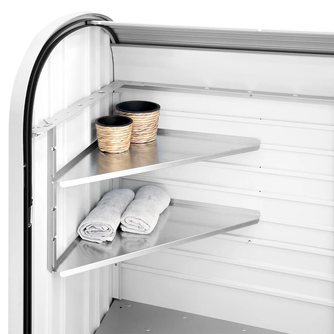 Das praktische Biohort StoreMax Eckregale-Set eignet sich für Ihren StoreMax Größe 120 und Größe 160. Es handelt sich dabei um 2 feuerverzinkte Stahlböden (Dreieckform – Seitenlänge 54 cm) mit Regalhalter, die 5-fach höhenverstellbar sind und sich auch nachträglich einfach ohne Werkzeug wahlweise links oder rechts einbauen lassen. Bitte beachten Sie: das Eckregale-Set ist nicht geeignet für StoreMax 190.