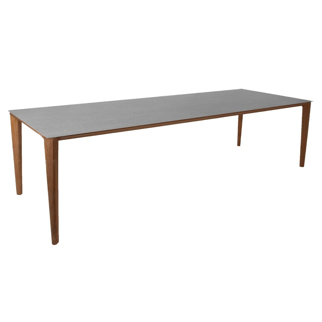 Sehr natürlich gehalten ist das Gestell des Tisches aus Teakholz gefertigt. Optisch ist das Gestell in Natur gehalten. Die Tischplatte ist aus edlem Keramik gefertigt. Im Gegensatz zu vielen anderen Tischplattenmaterialien sind Keramikplatten äußerst kälte- und hitzebeständig und zählen somit zu den robustesten Tischplatten auf dem Markt. Für ein elegantes Gesamtbild erscheint die Platte in der Farbe Basalt. Als klassische Design-Komponente fungiert das geradlinige Vierfußgestell. Mit der rechteckigen Form lässt sich der Gartentisch platzsparend in Ecken oder an Häuserwänden aufstellen.