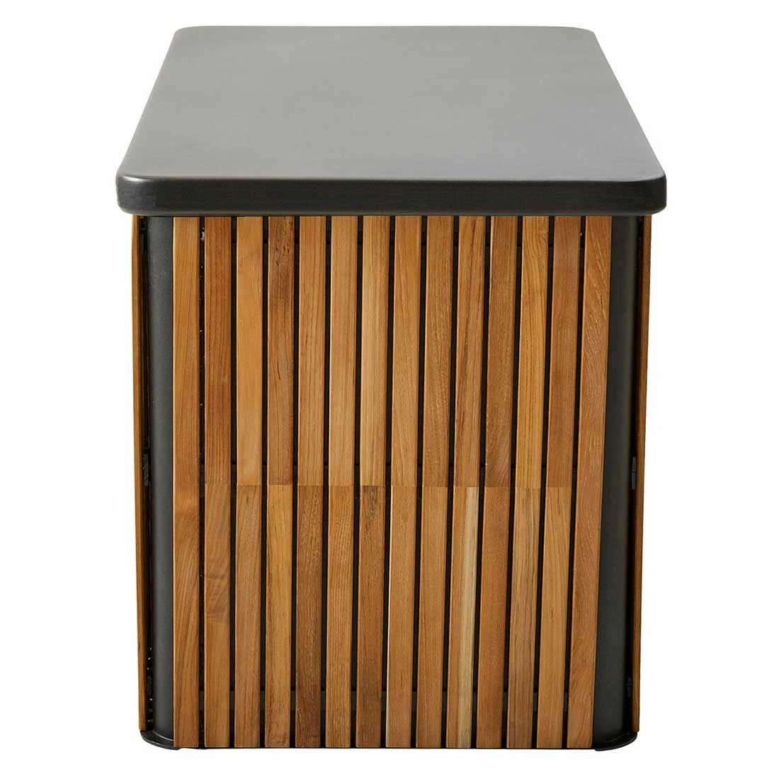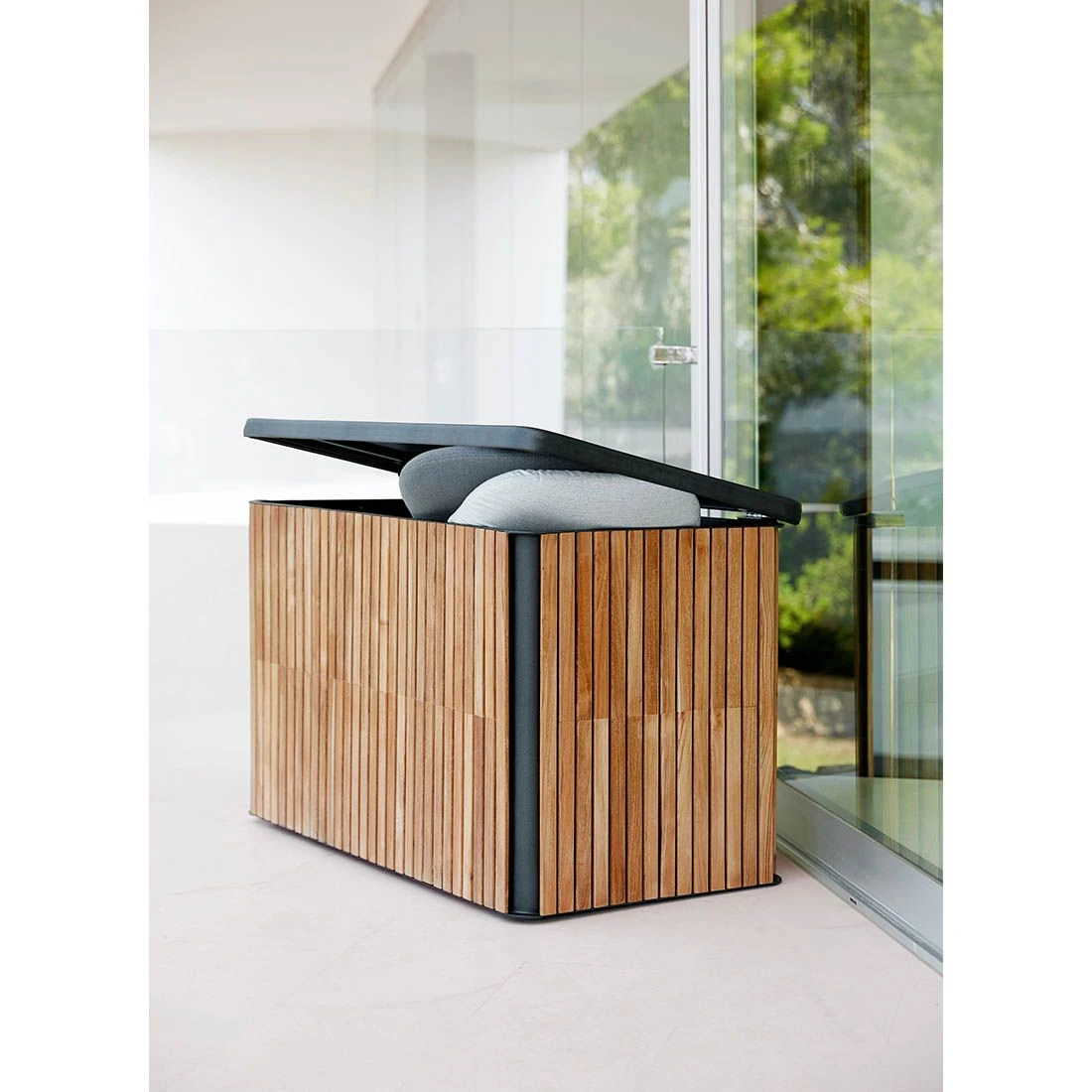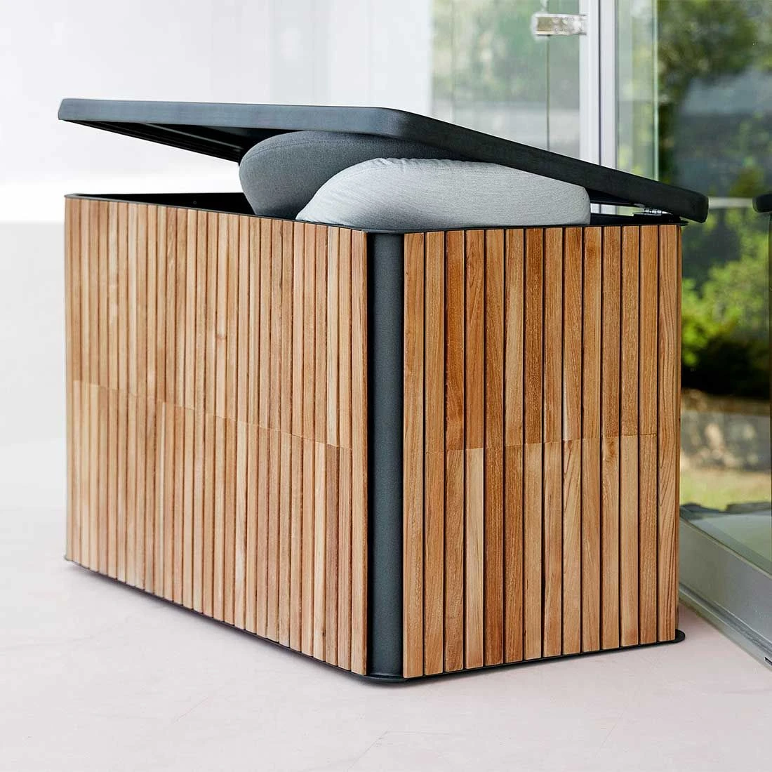 Der Korpus wird aus Teakholz gefertigt und bringt dadurch ein natürliches Flair auf Ihre Terrasse. Farblich ist die Gartenbox von Cane-Line in ansprechendem Natur gehalten. Ideal, um in verschiedene Gestaltungskonzepte integriert werden zu können.