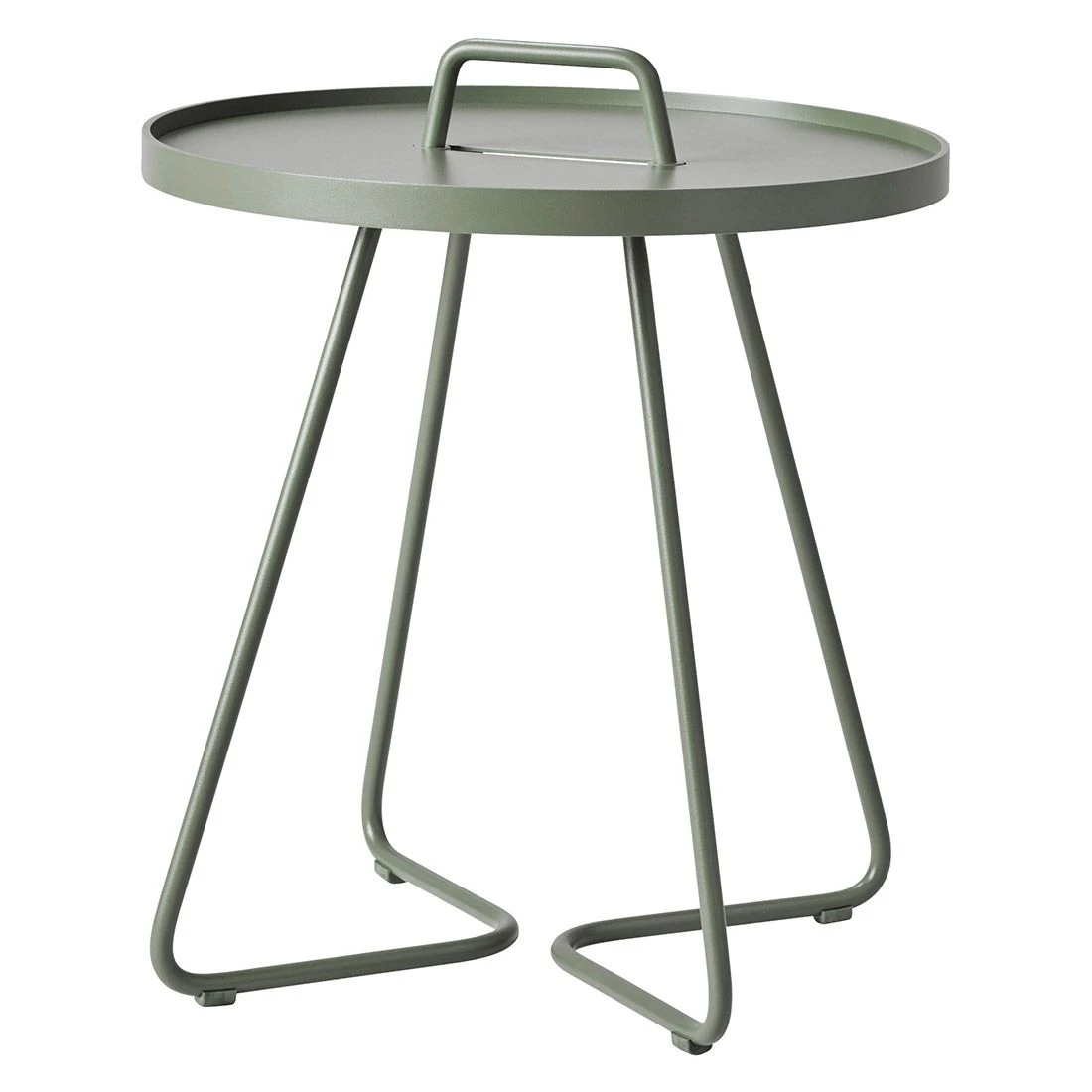 Das Gestell besticht mit seinen attraktiven Kufen. Der Beistelltisch ist komplett aus Aluminium (pulverbeschichtet) gefertigt und gibt so ein charmantes, einheitliches Bild auf der Terrasse ab. Farblich ist die Tischplatte in einem schönen Dusty Green gehalten. Der Beistelltisch ist in seinem Design klassisch rund .