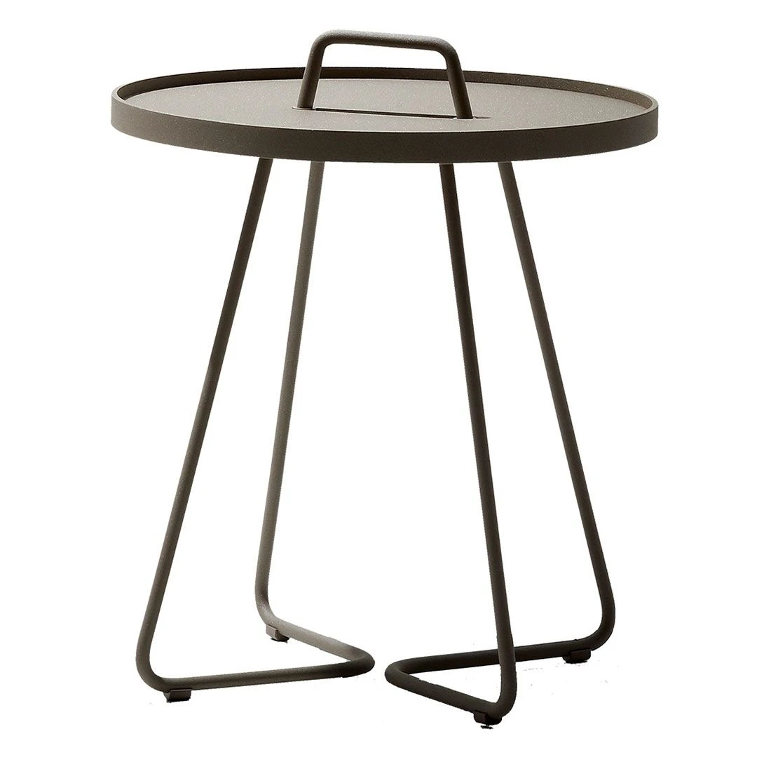 Der moderne Look des Beistelltischs wird durch die attraktiven Kufen nochmals betont. Sowohl die Tischplatte als auch das Gestell sind aus Aluminium (pulverbeschichtet) gefertigt. Farblich ist die Tischplatte in einem schönen Taupe gehalten. Die Form des Beistelltischs ist klassisch rund.