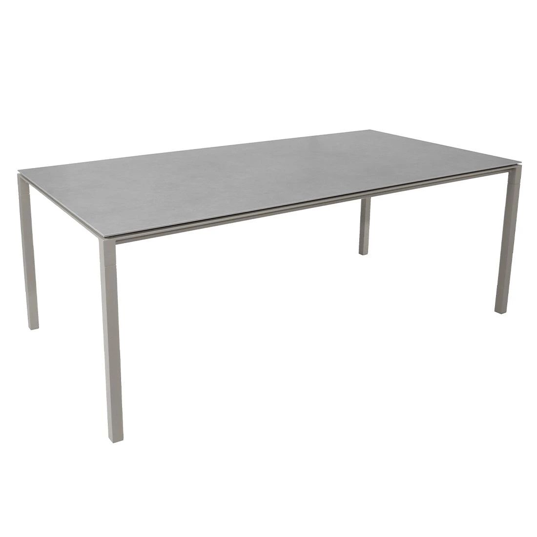 Mit seinem Gestell-Material Aluminium zählt der Gartentisch Pure zu den modernen Tischmodellen, die sich im Garten problemlos aufstellen und bewegen lassen. Optisch ist das Gestell in Taupe gehalten. Für die Tischplatte wird das Naturmaterial Keramik verwendet. Keramikplatten sind stoß-, schlag- und schnittbeständig und zählen somit zu den stabilsten Tischplatten auf dem Gartentisch-Markt. Für ein elegantes Gesamtbild erscheint die Platte in der Farbe Concrete Grey. Das klassische Vierfuß-Gestell garantiert Ihnen maximale Beinfreiheit. Der Gartentisch ist klassisch rechteckig gestaltet.