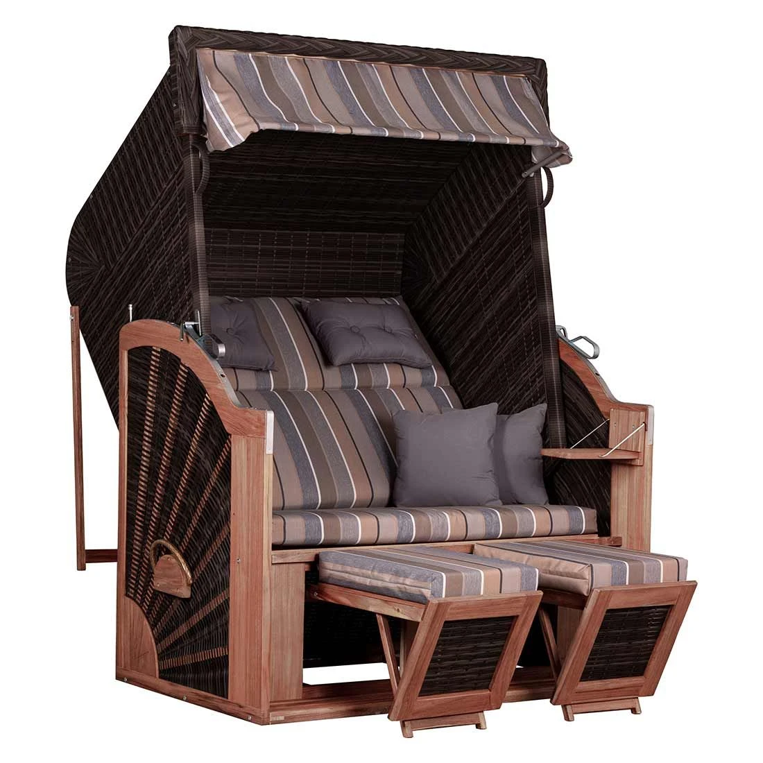 Nach einem langen Tag einfach mal die Füße hochlegen und abschalten: Genau hierfür gibt es den deVries Classic XL Strandkorb! Dieser entführt Sie nämlich gedanklich im Handumdrehen an den Strand. Doch wie im Urlaub, kann es auch bei Ihnen Schwankungen von Wind und Wetter geben, doch dank der komplett herausnehmbaren Kissenausstattung ist auch das absolut kein Problem. Der praktische Nutzen dieses Strandkorbs wird zudem durch die vielen Extras wie zwei Klapptische, ausziehbare Fußstützen und die leicht abnehmbare Markise unterstrichen. Wer außerdem auf viele Verstellmöglichkeiten Wert legt, ist hier goldrichtig: Dank dem großen Neigungswinkel, der verstellbaren Nackenkissen und den höhenverstellbaren Fußstützen können Sie den Strandkorb genau auf Ihre Bedürfnisse anpassen.