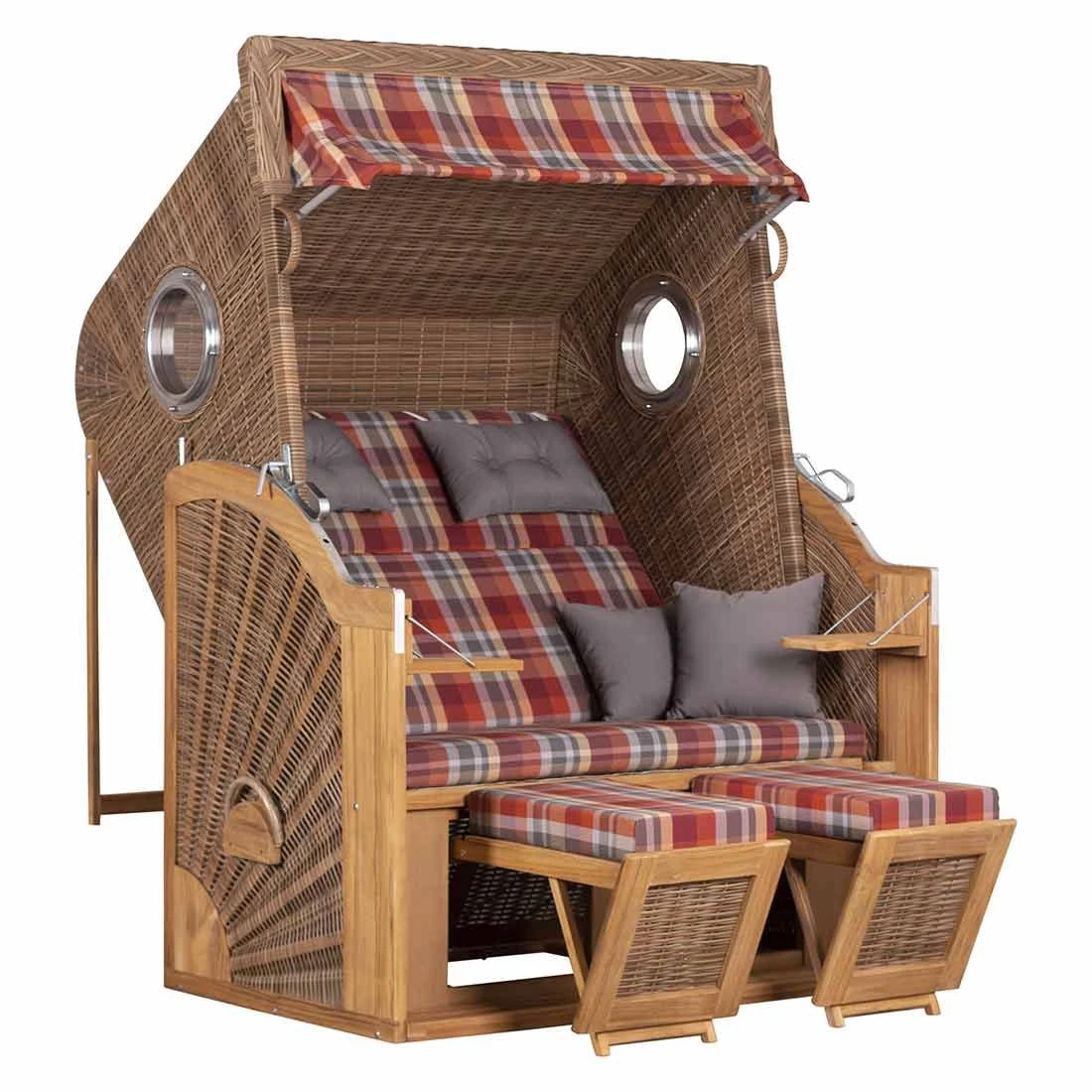 Holen Sie sich mit dem bequemen deVries Strandkorb Entspannung wie im Urlaub direkt in Ihrem Zuhause. Durch die Kombination von modernem Geflecht und hochwertigem Massivholz ist dieser Strandkorb nicht nur äußerst gemütlich, sondern zudem sehr stabil und robust. Die Verbindung der verschiedenen Materialien macht dieses Möbelstück besonders wertig, wodurch es sich auf jeder Terrasse und in jedem Garten sehen lassen kann. Dank der weiteren Individualisierungsmöglichkeiten können Sie diesen Strandkorb genau auf Ihre Bedürfnisse abstimmen. Um das Urlaubsfeeling passend abzurunden, bringt der Strandkorb noch reichlich Zubehör mit, damit sich Ihr Zuhause in eine traumhafte Wohlfühloase verwandelt.