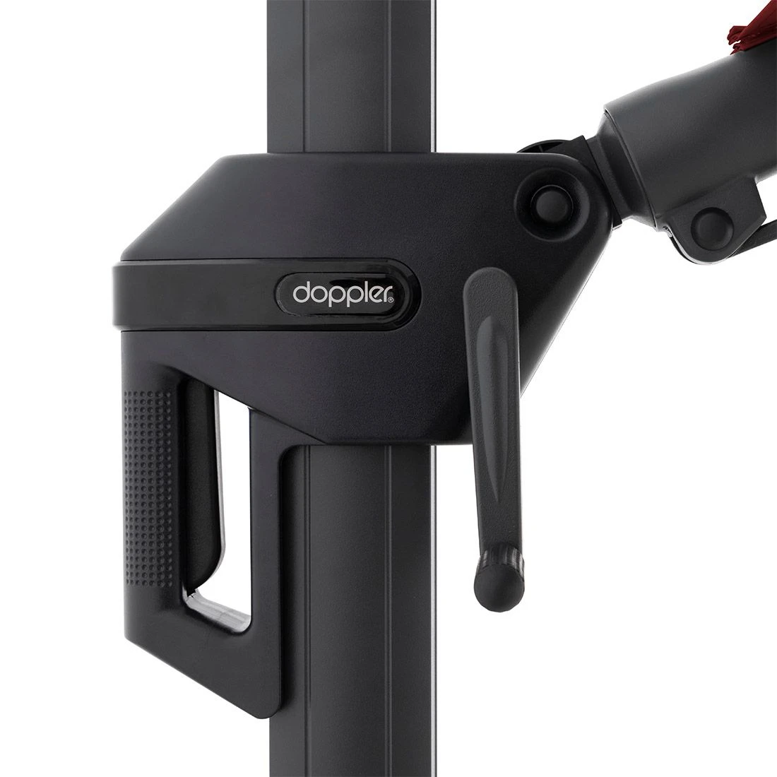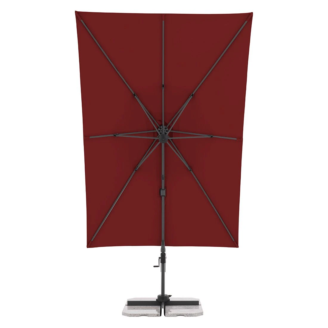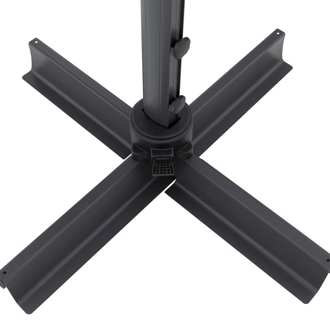 Der Mast ist aus hochwertigem, pulverbeschichtetem Aluminium in mattem Schwarz gefertigt. Zudem lässt sich der Pendelschirm einfach und mühelos zu jeder Tageszeit an den Sonnenstand anpassen. Dies wird durch die 360 Grad Drehfunktion, die Neigungsfunktion und den beidseitigen Schwenkmechanismus ermöglicht.