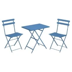 Das Gartenmöbel-Set begeistert damit, dass das Gestell, die Sitzfläche und die Tischplatte aus Stahl gefertigt sind. Dies erzeugt nicht nur ein elegantes, sondern auch ein einheitliches Gesamtbild. Für ein perfekt stimmiges Gesamtbild sorgt die einheitliche Farbgebung in stilvollem Marineblau. Komplettiert wird das Gesamtbild durch das moderne und außergewöhnliche Tischgestell in X-Form (sogenannten Cross Legs). Das Design des Tisches ist klassisch rechteckig gestaltet.