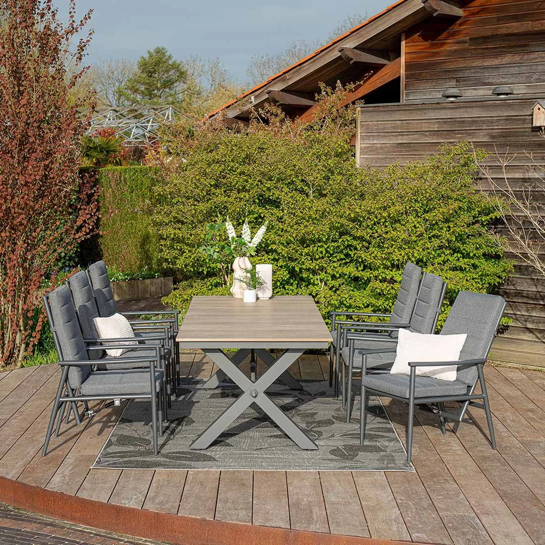 Das Gestell wird aus Aluminium gefertigt. Das geringe Eigengewicht des Materials macht den Gartensessel zu einem robusten, aber dennoch leicht zu transportierenden Sitzmöbel auf Ihrer Terrasse. Für eine attraktive Optik ist das Gestell im Farbton Carbon Black gehalten. Als hochwertiges Material für den Bezug kommt ein Polyester-Stoff zum Einsatz. Er ist sehr strapazierfähig und bietet somit die idealen Voraussetzungen für den Einsatz im Freien. Farblich begeistert der Bezug in elegantem Mystic Grey.