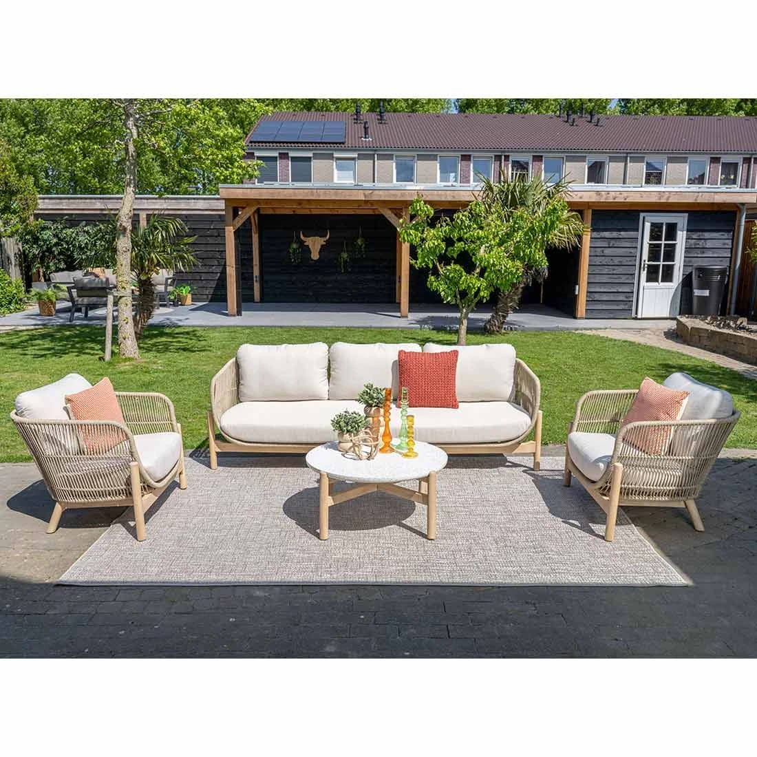 Allen Holzliebhabern wird gefallen, dass das Gestell des Loungesets aus hochwertigem Akazienholz gefertigt wird. Optisch begeistert das Gestell in der Farbe Akazie White Wash. Das Gestell ist mit Rope umflochten und bringt somit ein gemütliches Flair auf Ihre Terrasse. Der Korpus ist farblich in geschmackvollem Beige gestaltet. Der Bezug des Loungesets ist aus Polyester gefertigt. Für eine längere Haltbarkeit empfehlen wir bei stärkerem oder lang anhaltendem Regen, die abnehmbaren Kissen im Innenraum zu lagern. Die Farbe des Bezugs ist Sand. Die Tischplatte ist aus Polystone gefertigt und dadurch für den Einsatz auf der Terrasse, im Garten und auf dem Balkon geeignet. Passend zum Gesamtbild des Loungesets begeistert die Tischplatte mit ihrer Farbgebung in Weiß-Grau Meliert.