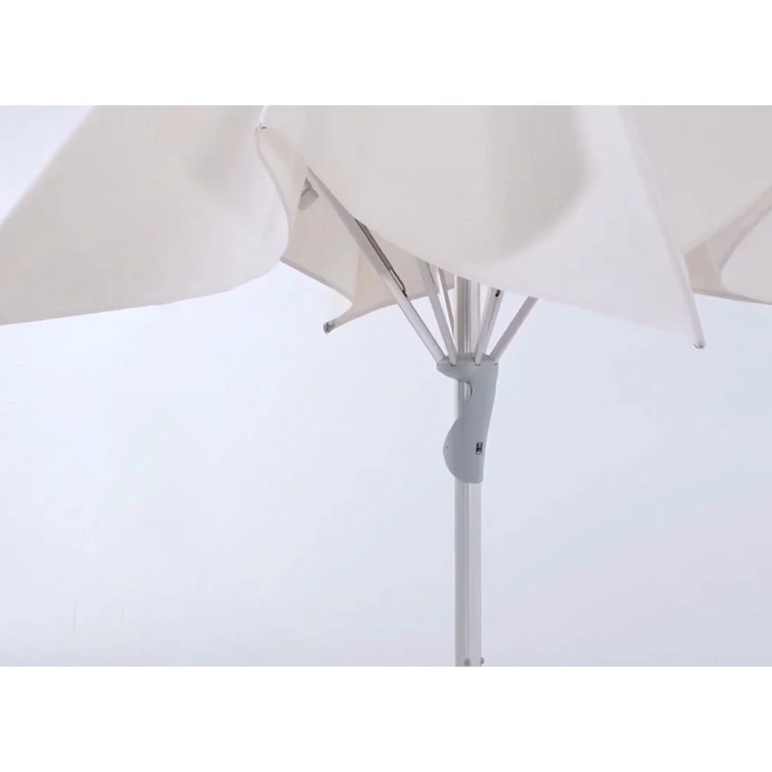 Bedienung: Einfach den Spannhebel nach unten ziehen und im Schieber einhängen. Durch das gegenläufige Servo-Prinzip gelingt dies mit minimalem Kraftaufwand. Eine Neigung des Schirmdaches ist bei diesem Modell nicht möglich.
