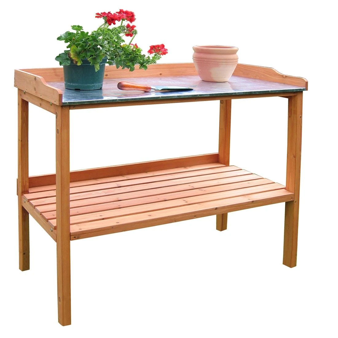 Dieser Pflanztisch stellt eine echte Erleichterung für alle Hobby-Gärtner dar, denn er ermöglicht ihnen das Arbeiten in einer angenehmen Höhe. So können Sie ganz bequem Blumentöpfe bepflanzen oder Pflänzchen pikieren ohne Ihren Körper durch dauerhaftes Bücken oder Knien zu belasten. Während der Tisch aus Holz besteht, wurde die Arbeitsplatte aus beschichtetem Stahl gefertigt und ist somit robust und pflegeleicht.