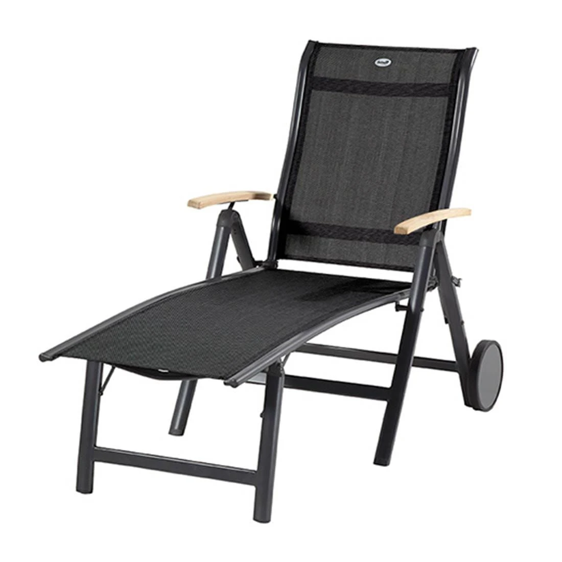 Das Gestell besteht aus pflegeleichtem und wetterfestem Aluminium. Farblich ist dieses in Dunkelgrau gehalten. Für die Bespannung der Sitzfläche wird hochwertiges Textilene verwendet. Es zeichnet sich durch eine hohe Robustheit gegenüber Hitze und Frost aus und ist leicht zu reinigen. Die Sitzfläche hat eine attraktive Farbgebung in Schwarz.