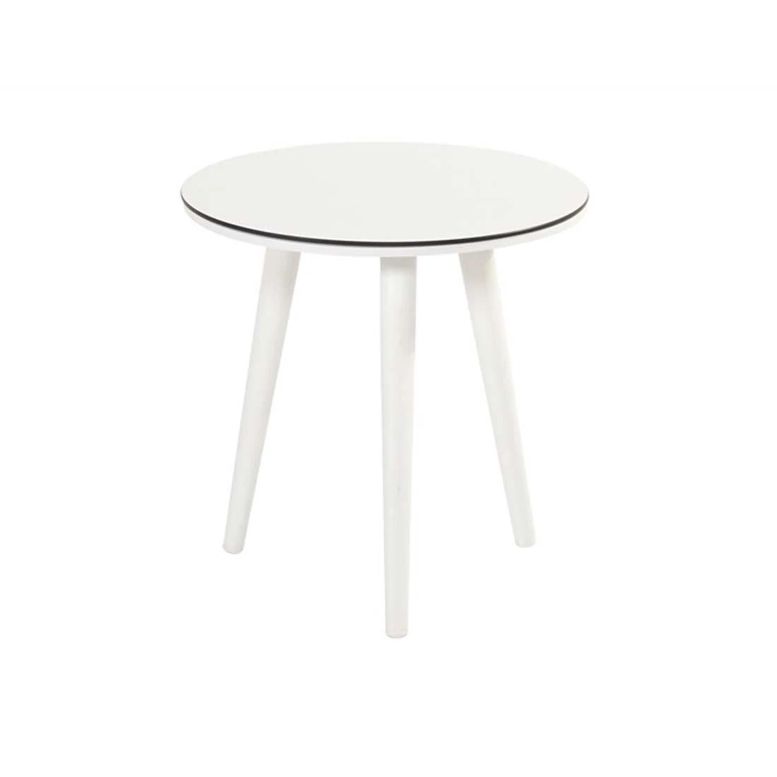 Das Gestell des eleganten Tisches ist aus Aluminium gefertigt. Durch die Dreibeinform des Gestells wird der Tisch optisch aufgelockert und erhält eine moderne und zeitgemäße Ausstrahlung. Die massive Tischplatte aus pflegeleichtem HPL-Kunststoffverbund ist speziell für den Einsatz im Freien und das Essen draußen bestens geeignet. Farblich ist die Platte in Weiß gehalten. Das Design des Beistelltischs ist klassisch rund.