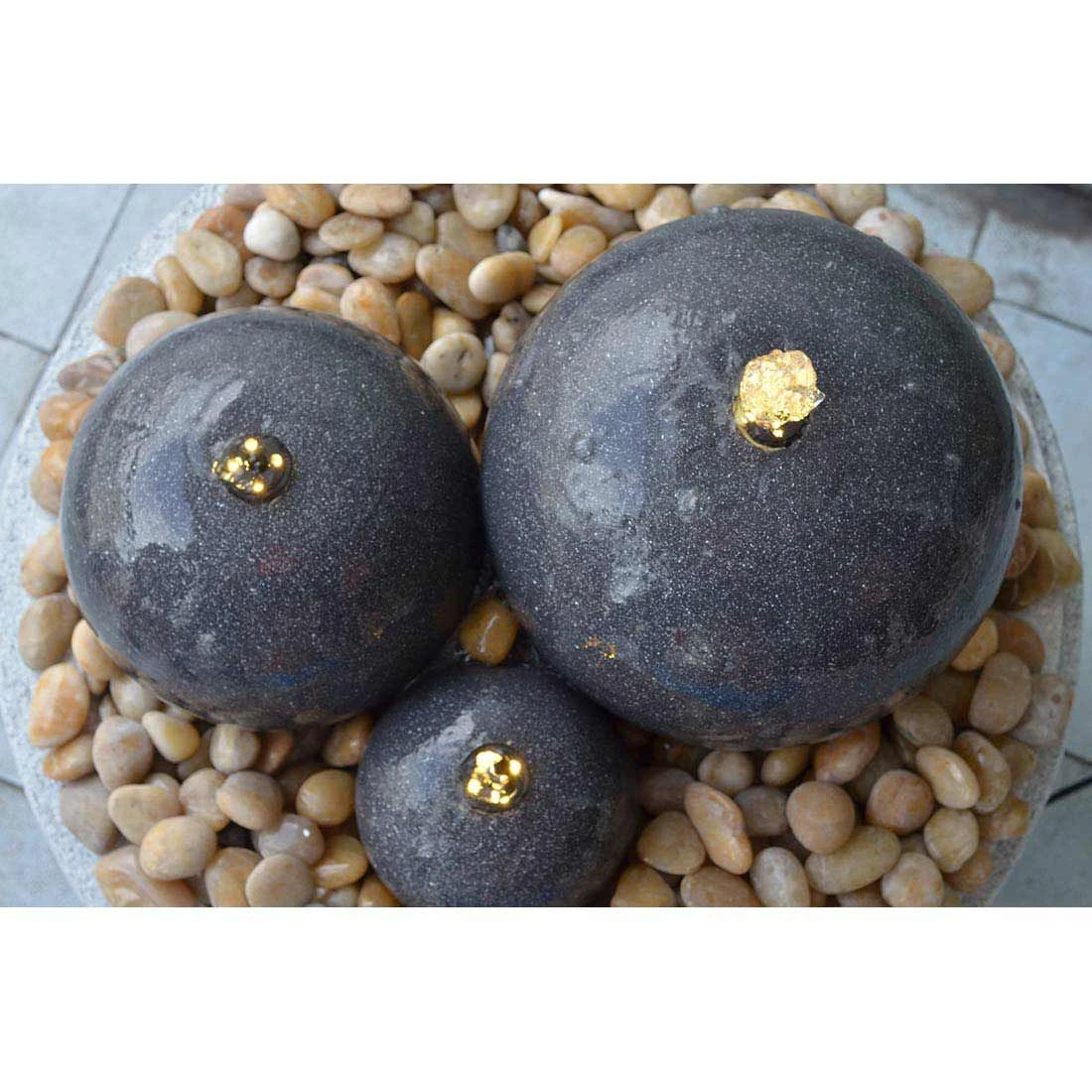 Oben sind die Kugeln mit einem kleinen Auslass versehen, in den eine LED-Beleuchtung integriert ist. Bereits in der Dämmerung und in der Nacht sorgt die LED-Beleuchtung für stimmungsvolle Lichteffekte im Wasser. Der edle Gartenbrunnen ist mit einer Pumpe ausgestattet, die das Wasser in den Kugeln nach oben befördert und sanft herabfließen lässt.