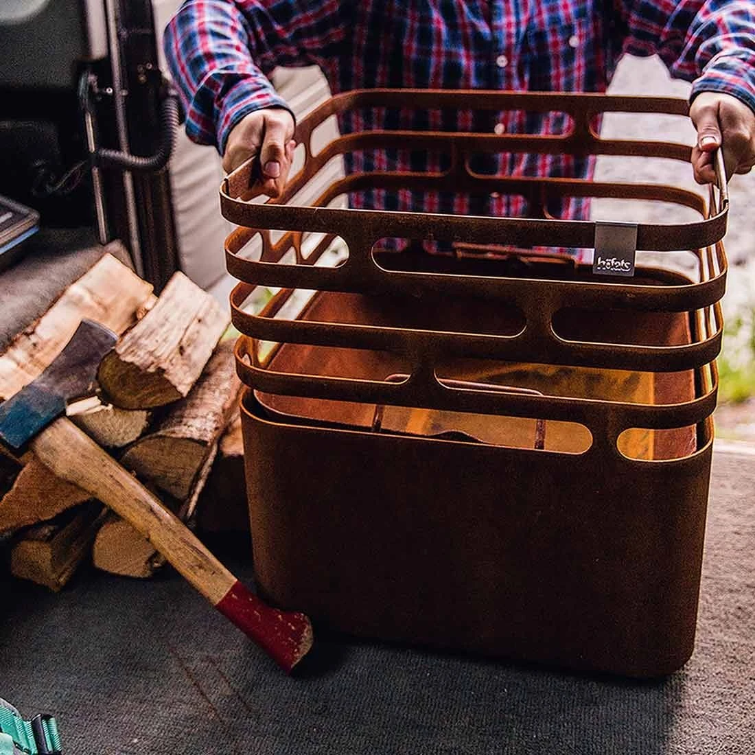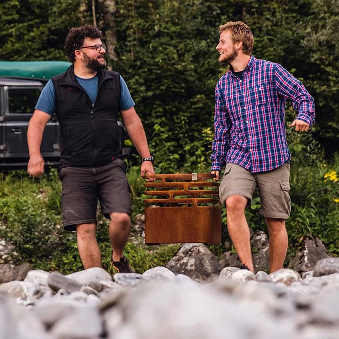 Der Cube von höfats ist Feuerkorb, Grill und Hocker in einem.
