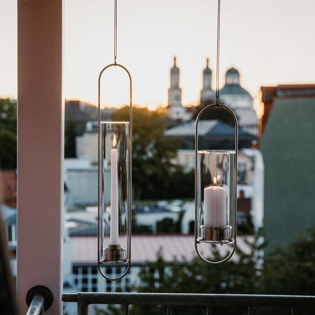 Das silberfarbene Windlicht zum Aufstellen oder Aufhängen schafft eine gemütliche Atmosphäre. Durch die ovale Form wirkt der Kerzenhalter elegant und funktional zugleich. Durch die Verwendung von robustem Edelstahl und Borosilikatglas ist das Windlicht sowohl für den Außen- als auch für den Innenbereich geeignet. Der Deckel mit Silikongriff verhindert in halb geöffnetem Zustand ein Erhitzen des Bügels, ganz geschlossen wird die Kerze gelöscht. Zum Lieferumfang gehören ein Edelstahlhalter und eine hitzebeständige Aramidkordel. So können Sie das Windlicht je nach Bedarf auf der Terrasse aufhängen oder im Garten auf den Tisch stellen.