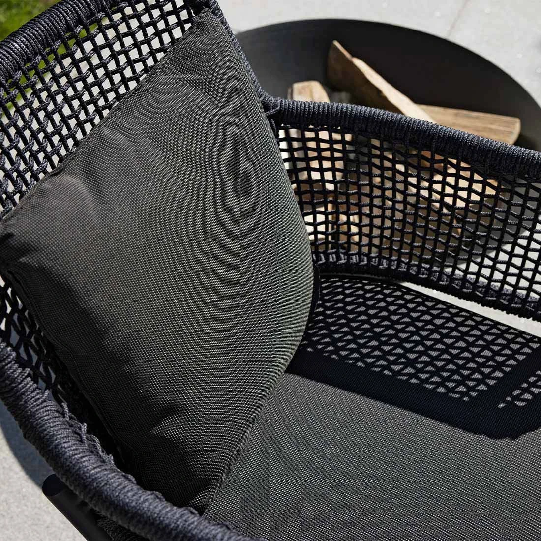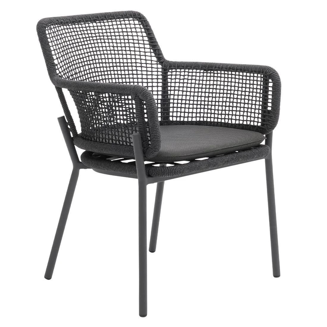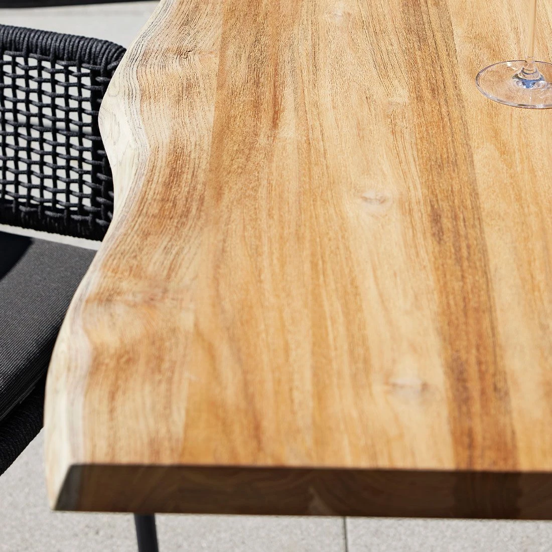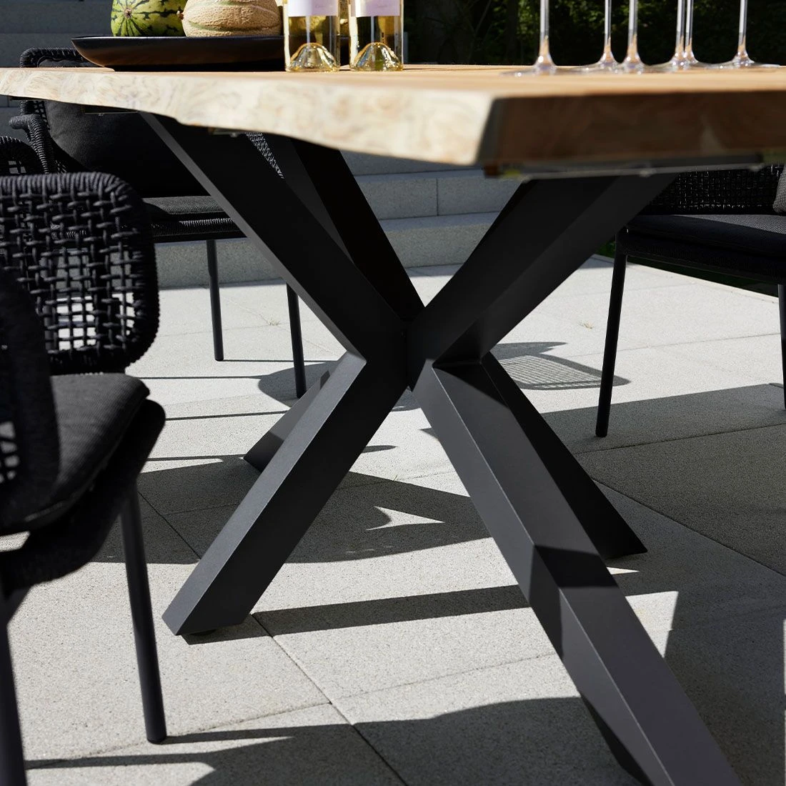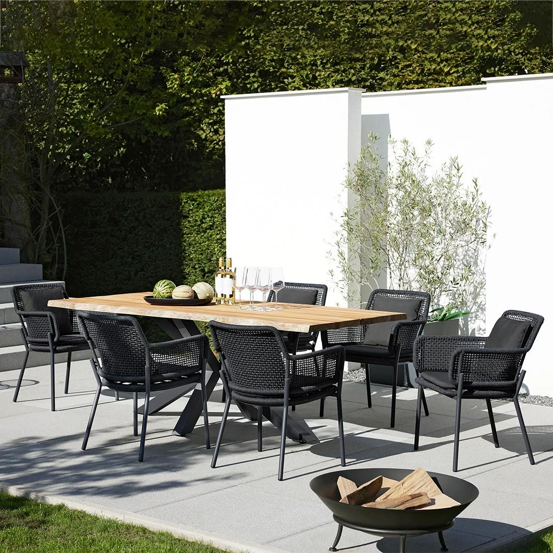 Die robusten Metallgestelle aus Aluminium sind pflegeleicht und garantieren gleichzeitig eine hohe Stabilität. Darüber hinaus gewährleistet dieses leichte Material, dass Sie die Möbel bequem transportieren können. Optisch ansprechend ist die Farbgebung der Gestelle in Anthrazit. Das robuste Sitzmobiliar ist von hochwertigem und auffälligem Rope-Geflecht umwoben. Für die Bezüge wird Olefin verwendet. Der Marken-Outdoorstoff überzeugt mit einer hohen Witterungsbeständigkeit. Denn sowohl Sonne als auch Regen können dem robusten Outdoor-Stoff kaum etwas anhaben. Farblich begeistern die Bezüge in elegantem Charcoal. Im Preis des Sets ist ein passender Tisch enthalten. Teakholz ist extrem widerstandsfähig gegen Witterungseinflüsse wie Temperaturschwankungen, Nässe und Trockenheit. Kein Wunder, dass dieses hochwertige Holz als Material für die Tischplatte verwendet wird. Die rechteckige Form ermöglicht es Ihnen, den Tisch in Ecken und an Häuserwänden platzsparend einzusetzen. Komplettiert wird das Gesamtbild durch das moderne und außergewöhnliche Tischgestell in X-Form (sogenannten Cross Legs). Farblich ist das Gestell in Anthrazit gehalten, die Tischplatte überzeugt in der Farbe Natur.