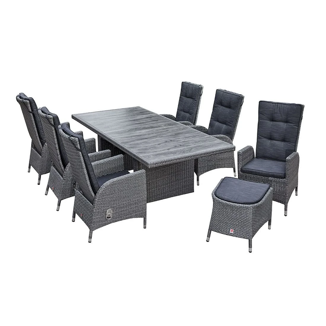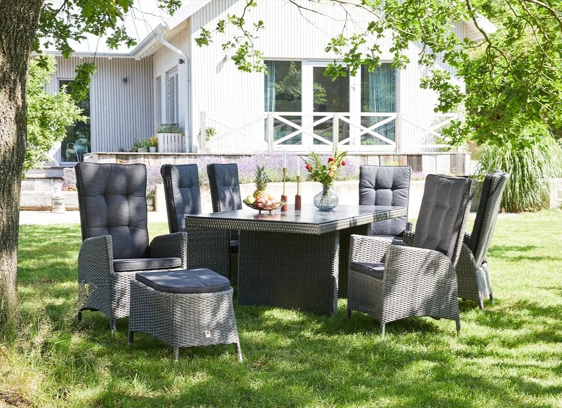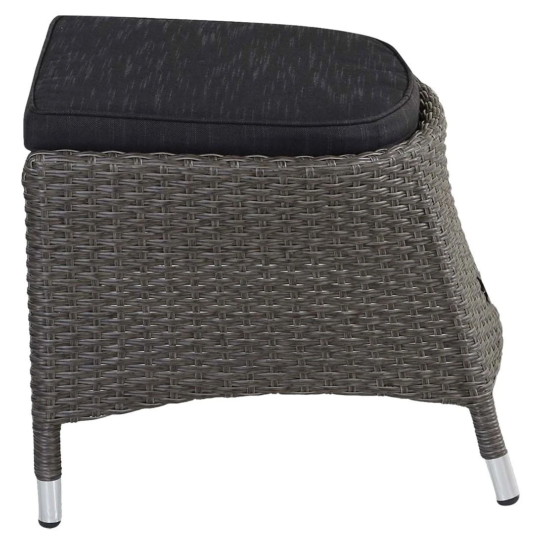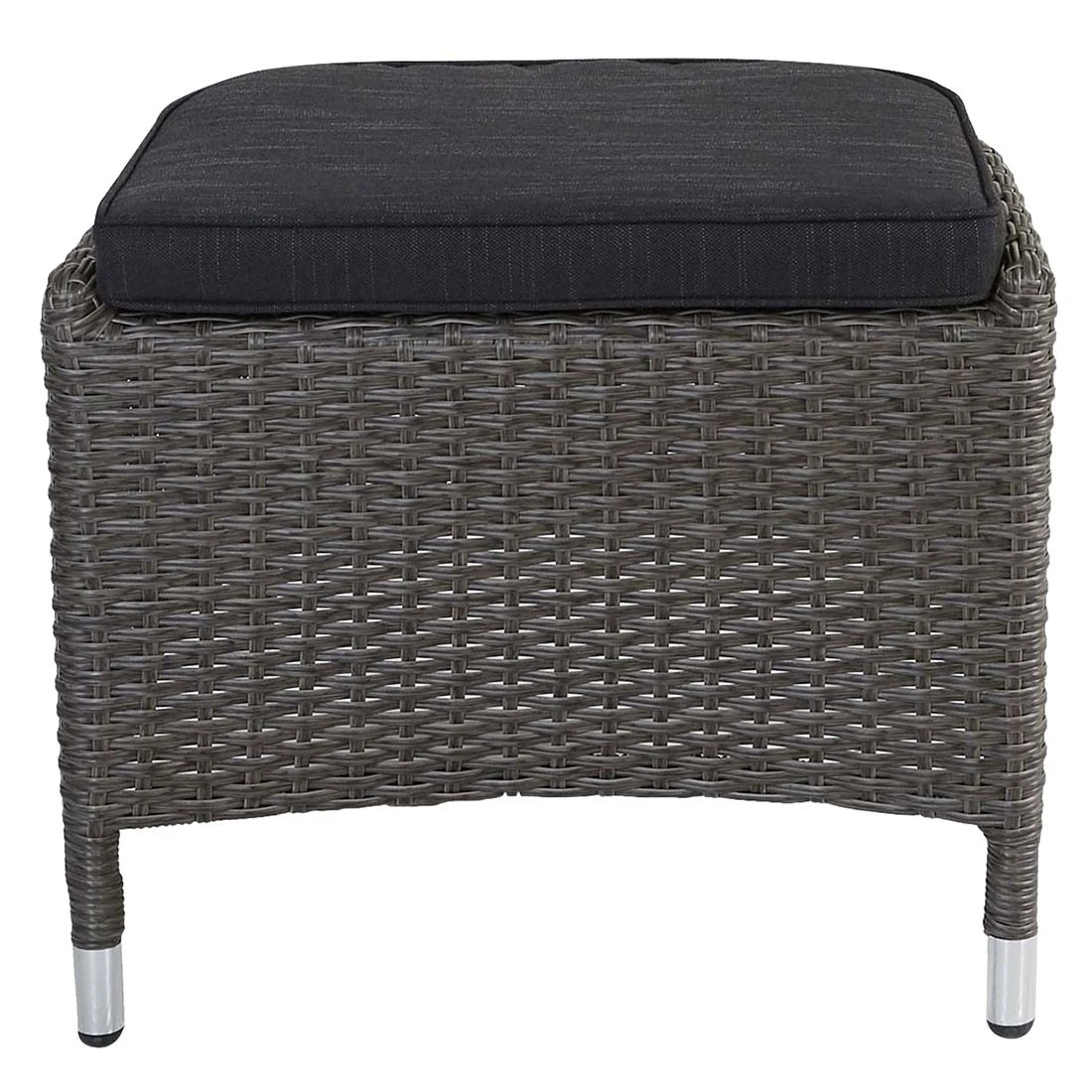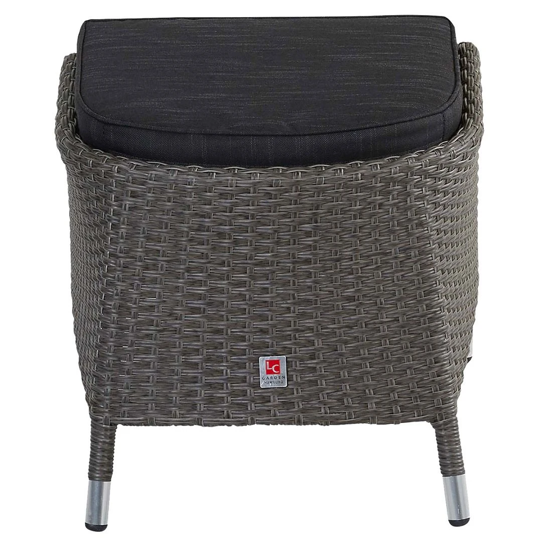 Der Korpus und die Sitzfläche bestehen aus Polyrattan-Geflecht. Für die Herstellung des Gestells wird hochwertiges und wetterfestes Aluminium verwendet. Als hochwertiges Material für den Bezug kommt ein Polyester-Stoff zum Einsatz. Er ist sehr strapazierfähig und bietet somit die idealen Voraussetzungen für den Einsatz im Freien. Damit der Gartenhocker optisch ansprechend ist, sind die Sitzfläche und der Bezug im Farbton Schwarz gehalten.