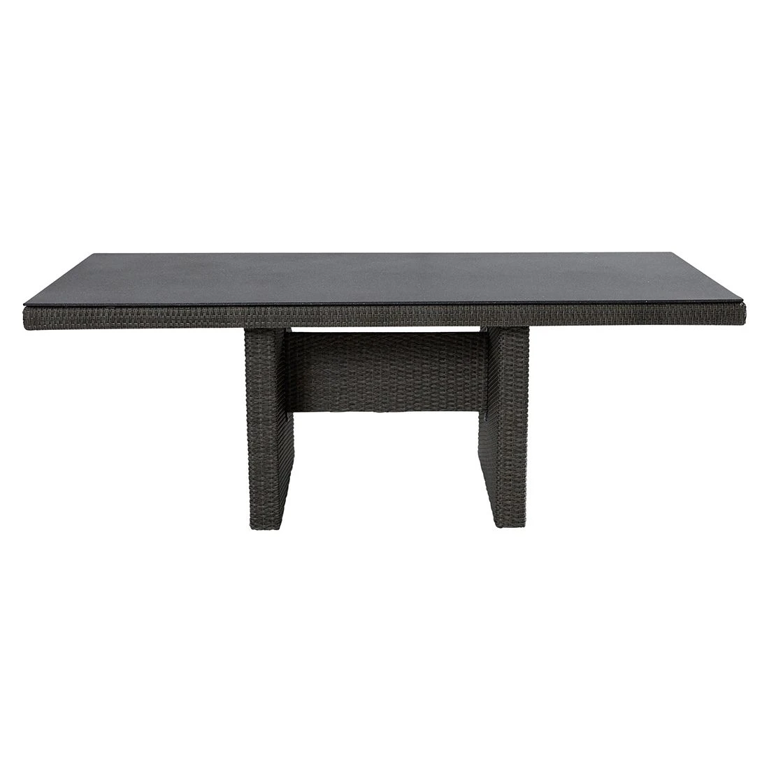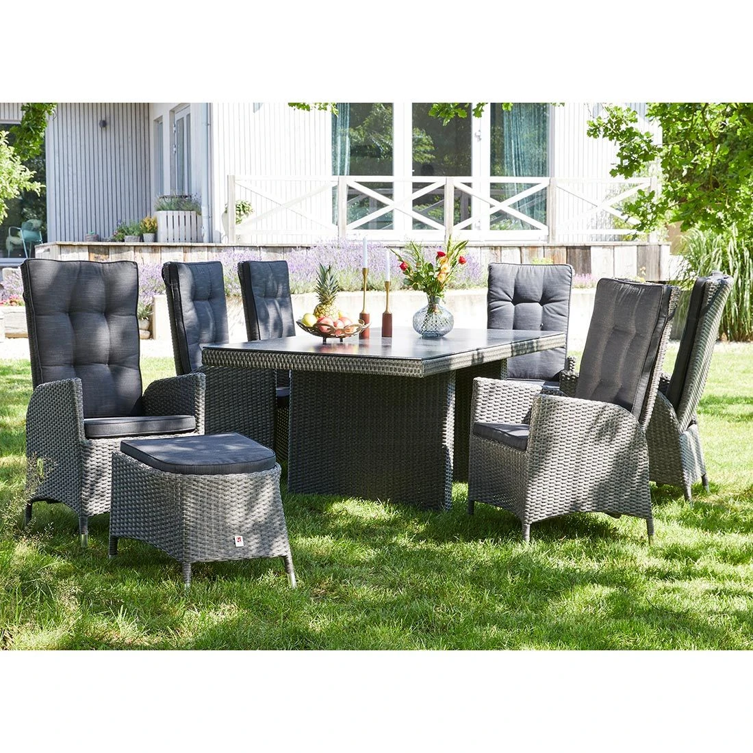 Das Gestell ist aus Aluminium gefertigt. Dadurch lassen sich die Möbel leicht von einem Standort zum nächsten transportieren und sind dennoch sehr stabil. Optisch ansprechend ist die Farbgebung der Gestelle in Anthrazit. Das elegante Polyrattan-Geflecht rundet das Gesamtbild des Sets stilvoll ab. Farblich begeistern die Bezüge in elegantem Schwarz. Für die Platte des im Sets enthaltenen Tisches wird mit Keramik beschichtetes Glas verarbeitet. Solche Platten sind stoß-, schlag- und schnittbeständig und zählen somit zu den stabilsten Tischplatten auf dem Gartentisch-Markt. Der Tisch ist klassisch rechteckig gestaltet. Als klassische Design-Komponente fungiert das geradlinige Vierfußgestell. Während die Farbe des Gestells Anthrazit ist, begeistert die Tischplatte in Schwarz.