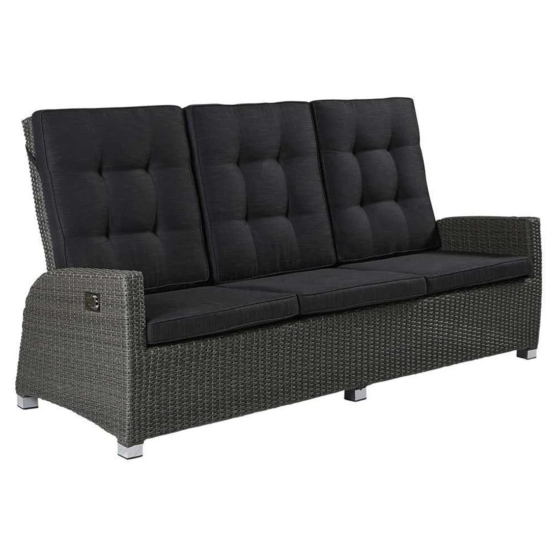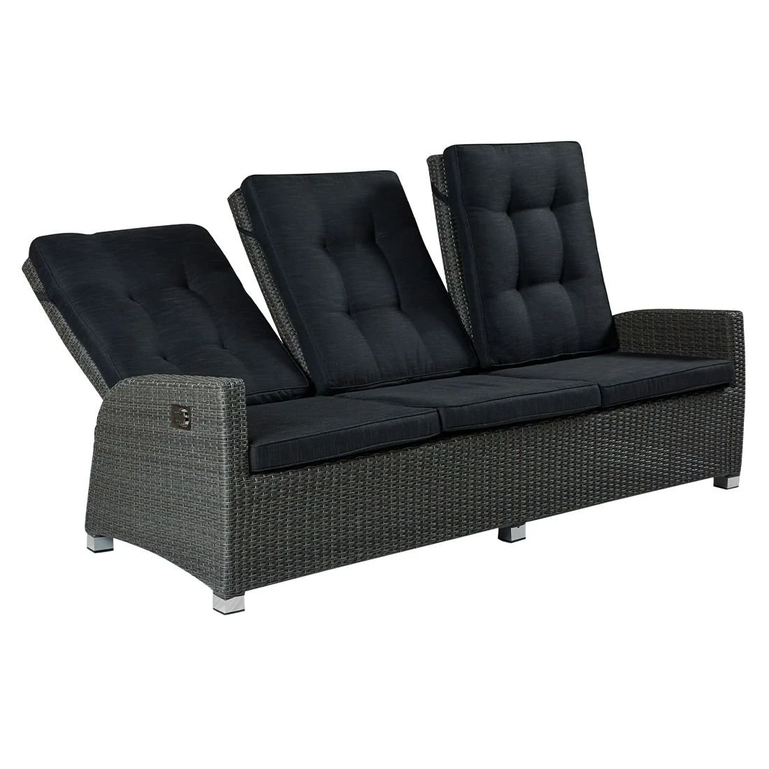 Für den Korpus und die Sitzfläche kommt Polyrattan-Geflecht zum Einsatz. Damit das Gartensofa optisch ansprechend ist, sind der Korpus und die Sitzfläche im Farbton Grau Mix gehalten. Das Gestell besteht aus Aluminium. Der Bezug des Gartensofas ist aus Polyester gefertigt. Auch wenn der Bezugsstoff Wind und Wetter trotzen kann, empfehlen wir, abnehmbare Kissen bei länger andauernder Feuchtigkeit und im Winter drinnen zu lagern. Die Farbe des Bezugs ist Schwarz.