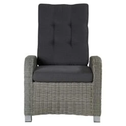 Für die Herstellung des Gestells wird hochwertiges und wetterfestes Aluminium verwendet. Die Sitzfläche des Gartensessels besteht aus qualitativ hochwertigem Polyrattan. Ein Material, das sich durch seine lange Haltbarkeit auszeichnet. Die Sitzfläche ist in ansprechendem Grau gehalten. Als hochwertiges Material für den Bezug kommt ein Polyester-Stoff zum Einsatz. Er ist sehr strapazierfähig und bietet somit die idealen Voraussetzungen für den Einsatz im Freien. Farblich begeistert der Bezug in elegantem Dunkelgrau.