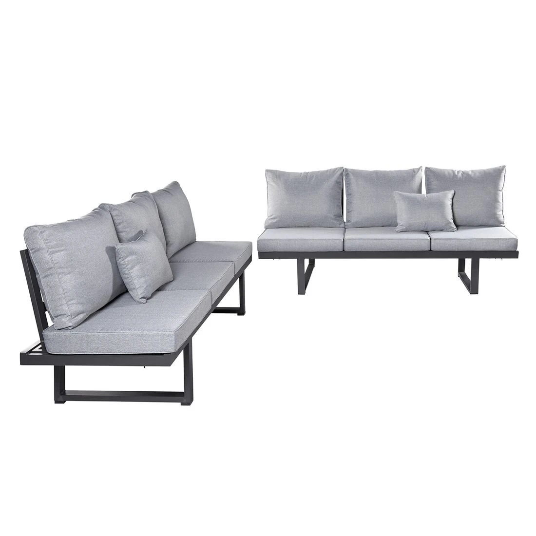 Das Gestell besteht aus Aluminium. Optisch begeistert das Gestell in der Farbe Anthrazit. Der Bezug des Loungesets ist aus Polyester gefertigt. Auch wenn der Bezugsstoff Wind und Wetter trotzen kann, empfehlen wir, abnehmbare Kissen bei länger andauernder Feuchtigkeit und im Winter drinnen zu lagern. Die Farbe des Bezugs ist Grau.