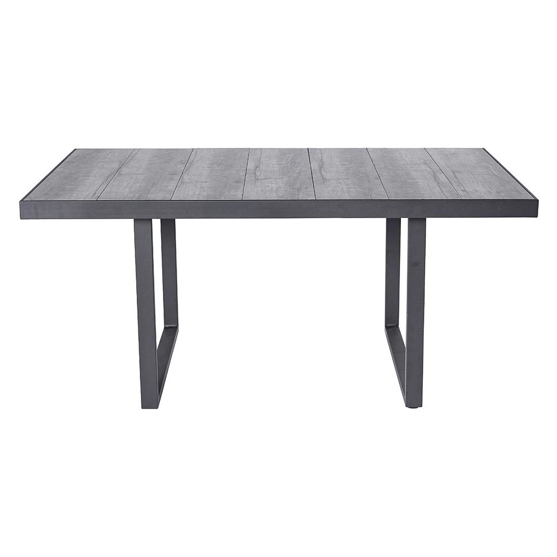 Dank des Gestell-Materials Aluminium zĂ€hlt der Gartentisch Keramo zu den modernen Tischmodellen, die sich im Garten und auf der Terrasse problemlos aufstellen und bewegen lassen. Farblich ist das Gestell in Anthrazit gehalten. Die Tischplatte ist aus wunderschönem Keramik gefertigt. Im Gegensatz zu vielen anderen Tischplattenmaterialien sind Keramikplatten Ă€uĂerst kĂ€lte- und hitzebestĂ€ndig und zĂ€hlen somit zu den robustesten Tischplatten auf dem Markt. FĂŒr ein elegantes Gesamtbild erscheint die Platte in der Farbe Holzoptik Dunkelgrau. Das Gestell besticht mit seinen attraktiven Kufen. Die rechteckige Form ermöglicht es Ihnen, den Gartentisch in Ecken und an HĂ€userwĂ€nden platzsparend einzusetzen.