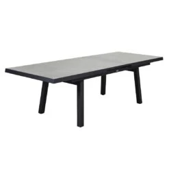 Dank des Gestell-Materials Aluminium zählt der Ausziehtisch Sondrino zu den modernen Tischmodellen, die sich auf der Terrasse komfortabel aufstellen und bewegen lassen. Klassisch aus vier Tischbeinen besteht das Gestell des Tisches. Die Tischplatte ist aus wunderschönem Keramik gefertigt. Im Gegensatz zu vielen anderen Tischplattenmaterialien sind Keramikplatten äußerst kälte- und hitzebeständig und zählen somit zu den robustesten Tischplatten auf dem Markt. Farblich ist die Tischplatte in einem schönen Beton Optik gehalten. Mit der rechteckigen Form lässt sich der Ausziehtisch platzsparend in Ecken oder an Häuserwänden aufstellen.