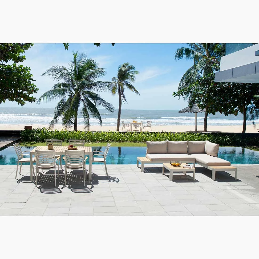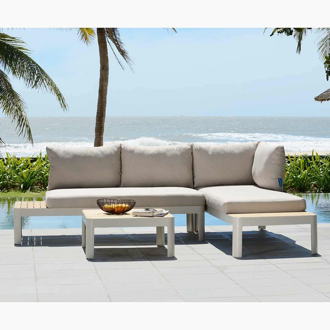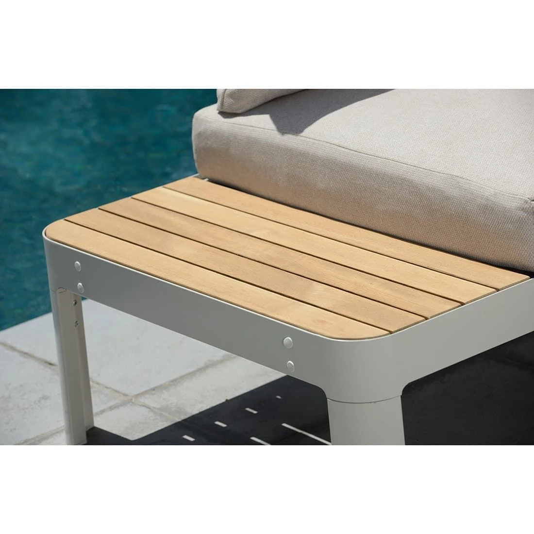 Als Gestellmaterial hat der Hersteller qualitativ hochwertiges Aluminium gewählt. Optisch begeistert das Gestell in der Farbe Korallensand. Die wetterfeste Sitzfläche aus Teakholz bringt ein natürliches Flair auf Ihre Terrasse. Die Bezüge sind aus dem Marken-Outdoorstoff Olefin gefertigt. Das Material verbindet eine angenehme Stoffoberfläche mit hoher Witterungsbeständigkeit. Denn sowohl Sonne als auch Regen können dem robusten Outdoor-Stoff kaum etwas anhaben. Die Farbe des Bezugs ist Beige.