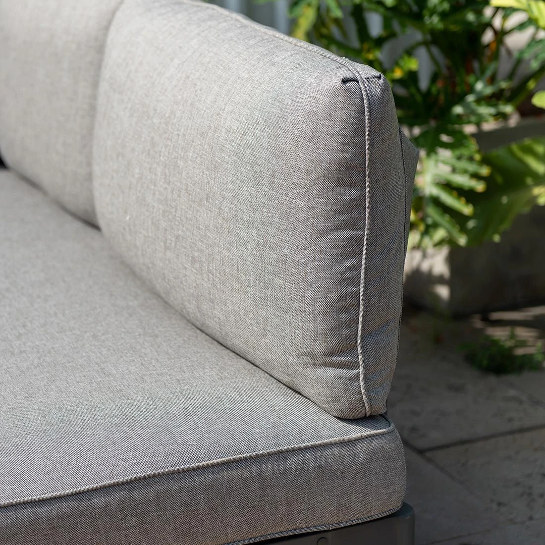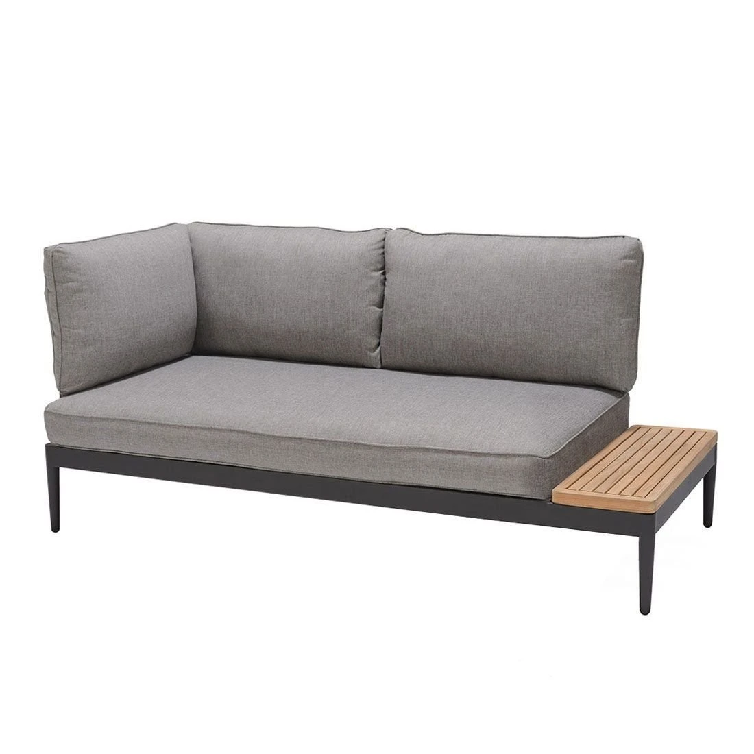 Das Gestell ist aus Aluminium hergestellt. Als klassische Design-Komponente fungiert das geradlinige Vierfußgestell. Die Bezüge sind aus dem Marken-Outdoorstoff Olefin in der Farbe Grau gefertigt. Das Material verbindet eine angenehme Stoffoberfläche mit hoher Witterungsbeständigkeit. Denn sowohl Sonne als auch Regen können dem robusten Outdoor-Stoff kaum etwas anhaben. Als Material für die Tischplatte wird das wertvolle Hartholz Teak verwendet. Die Maserung dieses Holzes und der gemütliche Farbton integrieren sich sehr schön in jegliche Arten der Garten- und Balkongestaltung und verbreiten eine besonders natürliche Atmosphäre.
