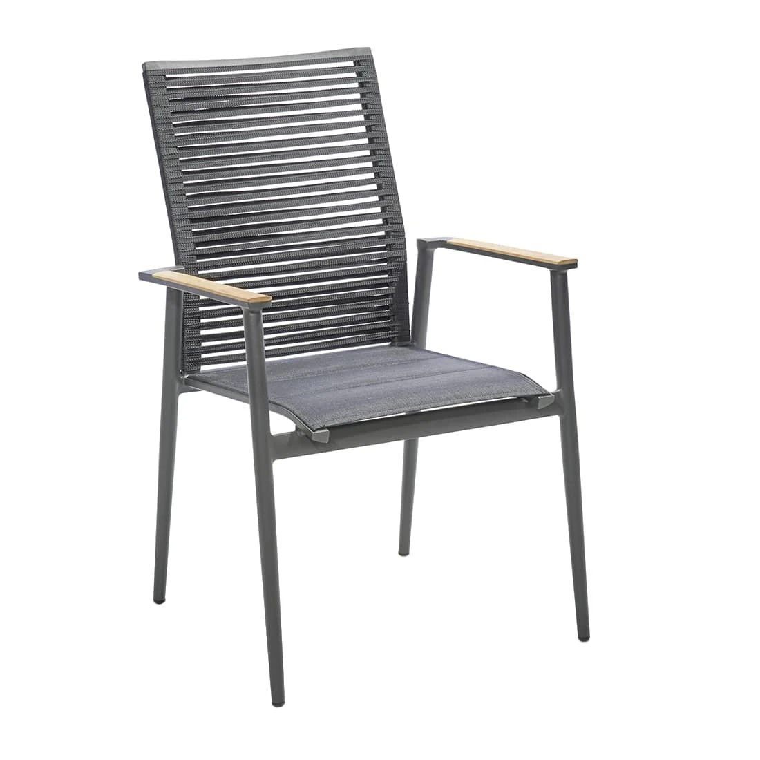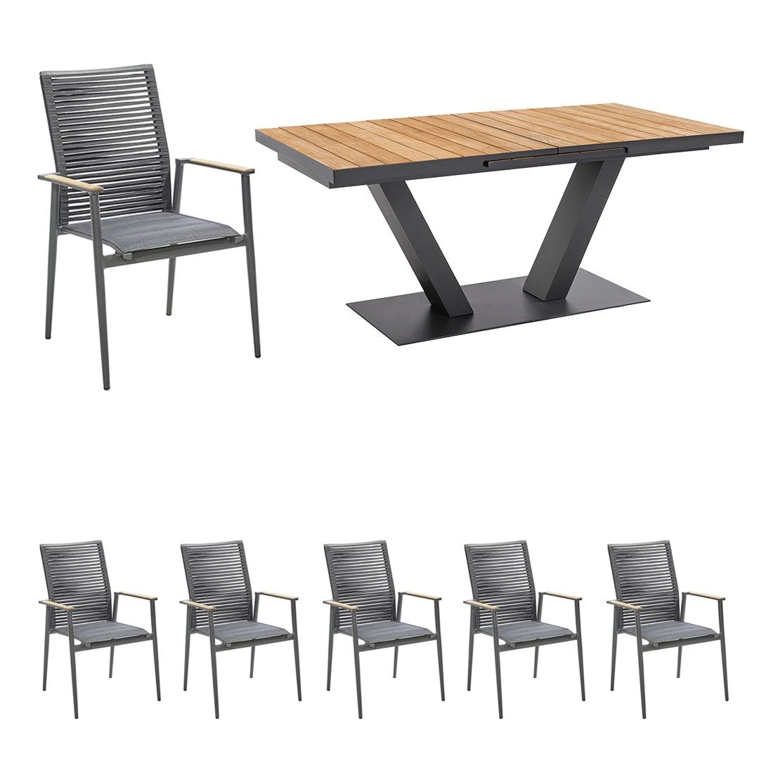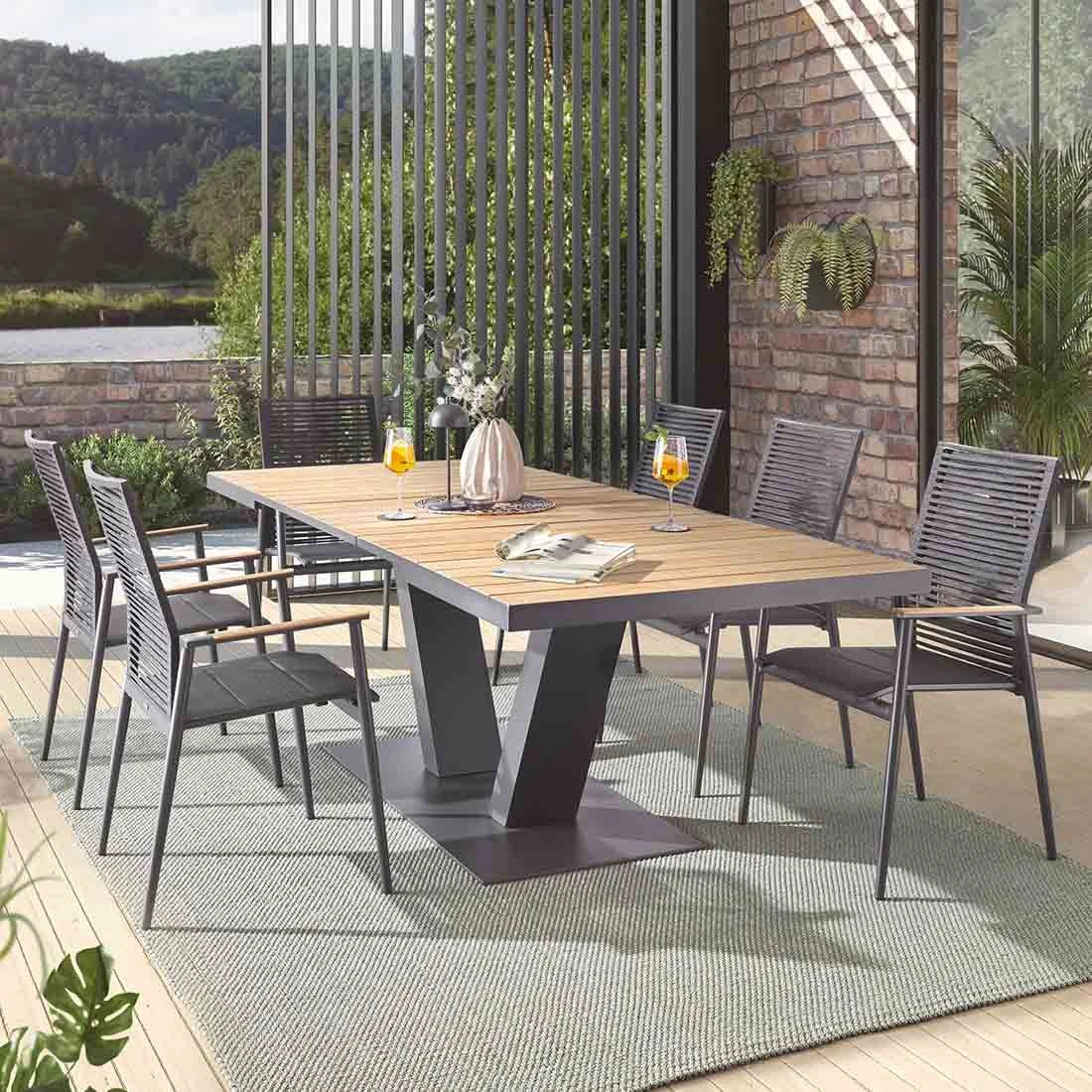 Das Gestell ist aus Aluminium gefertigt. Dadurch lassen sich die Möbel leicht von einem Standort zum nächsten transportieren und sind dennoch sehr stabil. Ein weiterer Pluspunkt der Sitzmöbel ist die Bespannung der Sitzflächen mit Textilene. Dieses Material zeichnet sich durch eine hohe Robustheit gegenüber Hitze und Frost aus und ist leicht zu reinigen. Zum Lieferumfang des Sets gehört auch ein passender Tisch. Als Material für die Tischplatte wird das edle Hartholz Teak gewählt. Die Maserung dieses Holzes und der angenehme Farbton integrieren sich perfekt in das Gesamtbild eines jeden Gartens und verbreiten eine besonders natürliche Atmosphäre. Die Form des Tisches ist klassisch rechteckig gestaltet. Ein stabiler Unterbau und dabei gleichzeitig dekorativ ist das Säulengestell. Passend zum Gesamtbild des Gartenmöbel-Sets begeistert die Tischplatte mit ihrer Farbgebung in Natur, während das Gestell in Anthrazit gehalten ist.