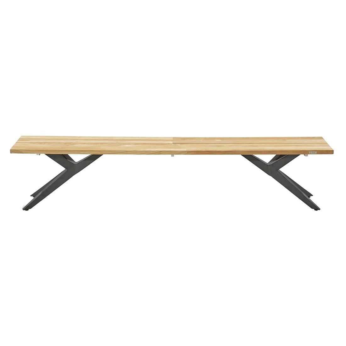 Das Gestell besteht aus pflegeleichtem und wetterfestem Aluminium. Für eine attraktive Optik ist das Gestell im Farbton Anthrazit gehalten. Als Ergänzung zum Gestell wartet die Gartenbank mit einer Sitzfläche aus Teakholz auf. So gelingt es, das Möbelstück mit hervorragenden Materialeigenschaften besonders robust zu gestalten. Die Sitzfläche ist in ansprechendem Teak gehalten.