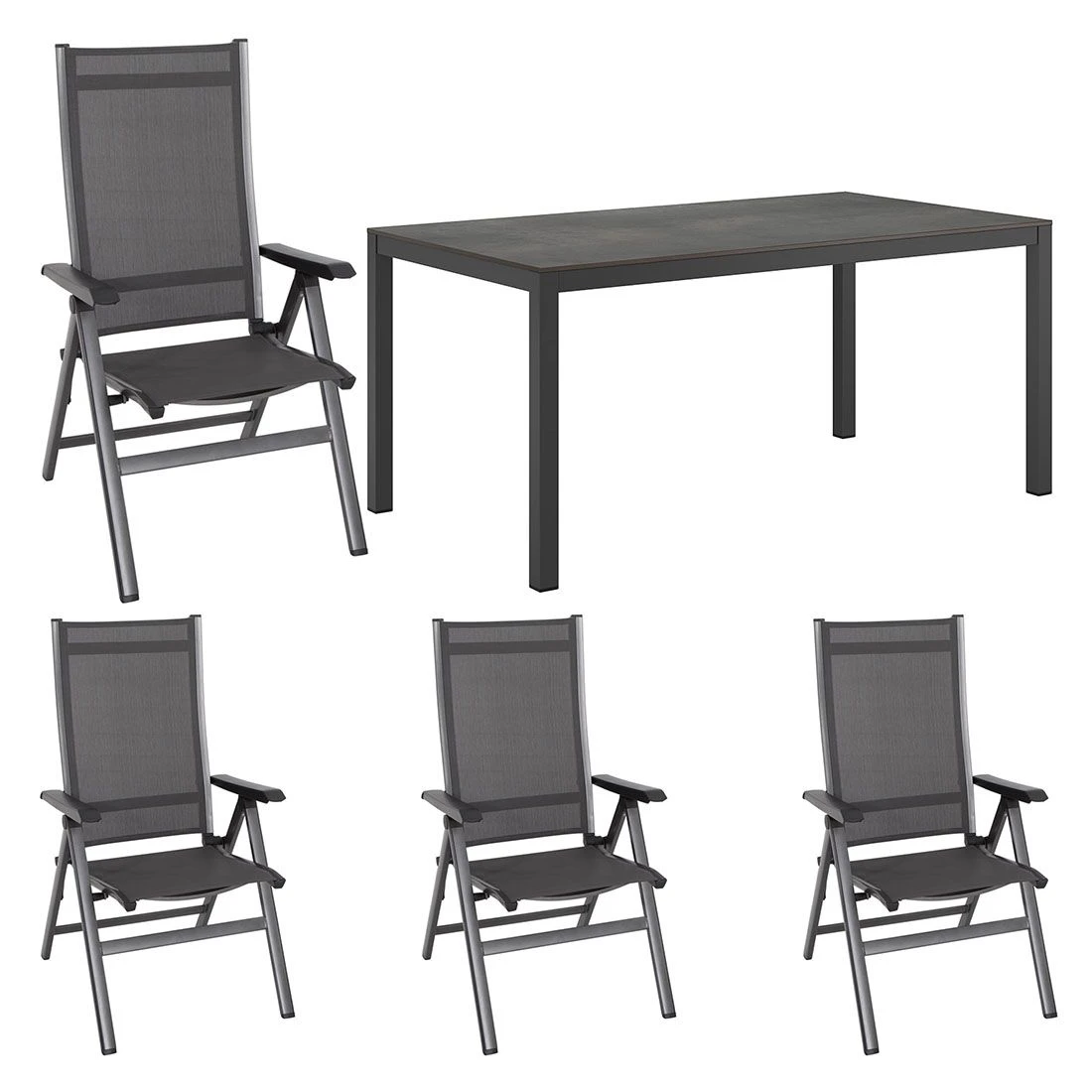 Die robusten Metallgestelle aus Aluminium sind pflegeleicht und garantieren gleichzeitig eine hohe Stabilität. Darüber hinaus gewährleistet dieses leichte Material, dass Sie die Möbel bequem transportieren können. Optisch ansprechend ist die Farbgebung der Gestelle in Eisengrau. Ein weiteres Highlight der Sitzmöbel ist die Bespannung der Sitzflächen mit Textilene. Dieses Material zeichnet sich durch eine hohe Robustheit gegenüber Hitze und Frost aus und ist leicht zu reinigen. Im Set enthalten ist zudem ein Tisch. Die formschöne HPL-Tischplatte ist nicht nur ein optischer Hingucker, sondern besitzt auch eine außerordentlich massive und durchaus kratzfeste Oberfläche, die sämtlichen Belastungen entgegenwirkt. Der Tisch ist klassisch rechteckig gestaltet. Als klassische Design-Komponente fungiert das geradlinige Vierfußgestell. Farblich ist das Gestell in Eisengrau gehalten, die Tischplatte überzeugt in der Farbe Zement Dunkel.