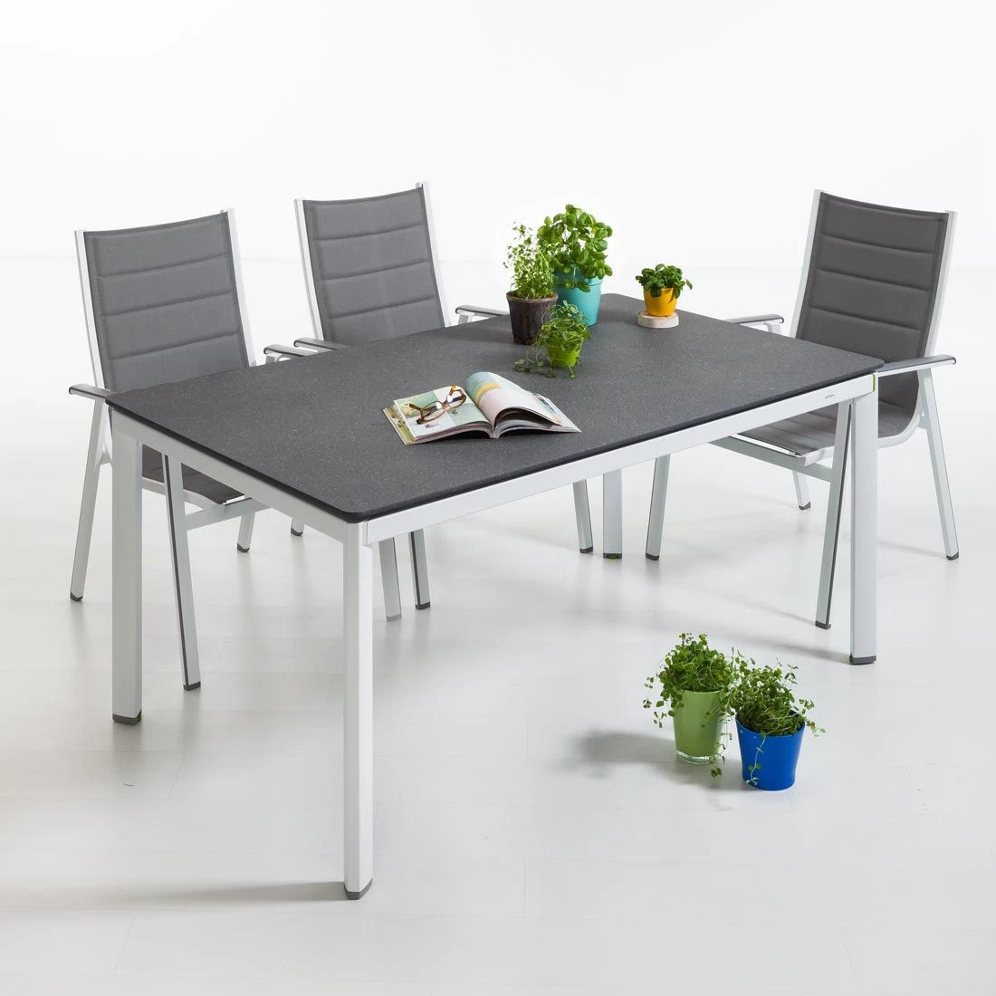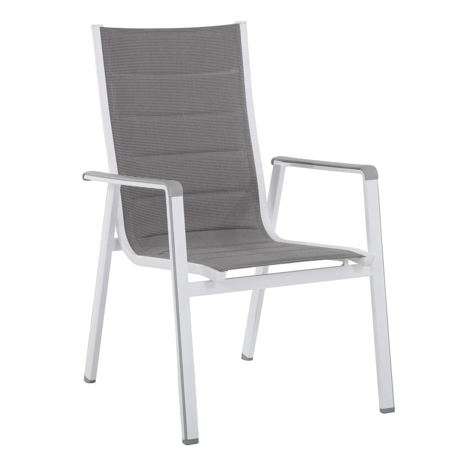 Die Sitzfläche und der Bezug sind aus Textilene gefertigt. Für die Herstellung des Gestells wird hochwertiges und wetterfestes Aluminium verwendet. Für eine attraktive Optik ist das Gestell im Farbton Weiß gehalten. Damit der Stapelsessel optisch ansprechend ist, sind die Sitzfläche und der Bezug im Farbton Grau gehalten.