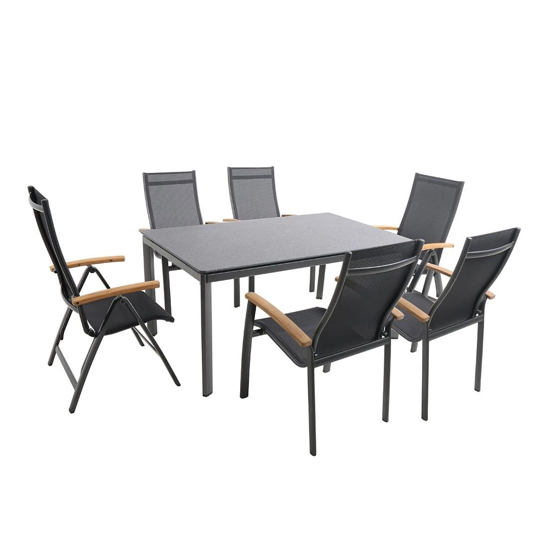 Das Gestell ist aus Aluminium gefertigt. Dadurch lassen sich die Möbel leicht von einem Standort zum nächsten transportieren und sind dennoch sehr stabil. Ein weiterer Pluspunkt ist die Bespannung der Sitzflächen mit Textilene. Dieses Material zeichnet sich durch eine hohe Robustheit gegenüber Hitze und Frost aus und ist leicht zu reinigen. Die Farbgebung der Sitzfläche ist Schwarz. Zum Set gehört auch ein passender Tisch. Dessen Tischplatte ist aus Faserzement gefertigt und rundet das stimmige Gesamtbild des Gartenmöbel-Sets ab. Passend zum Gesamtbild des Gartenmöbel-Sets begeistert die Tischplatte mit ihrer Farbgebung in Granit. Die Form des Tisches ist klassisch rechteckig gestaltet.