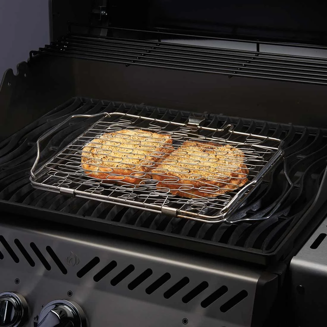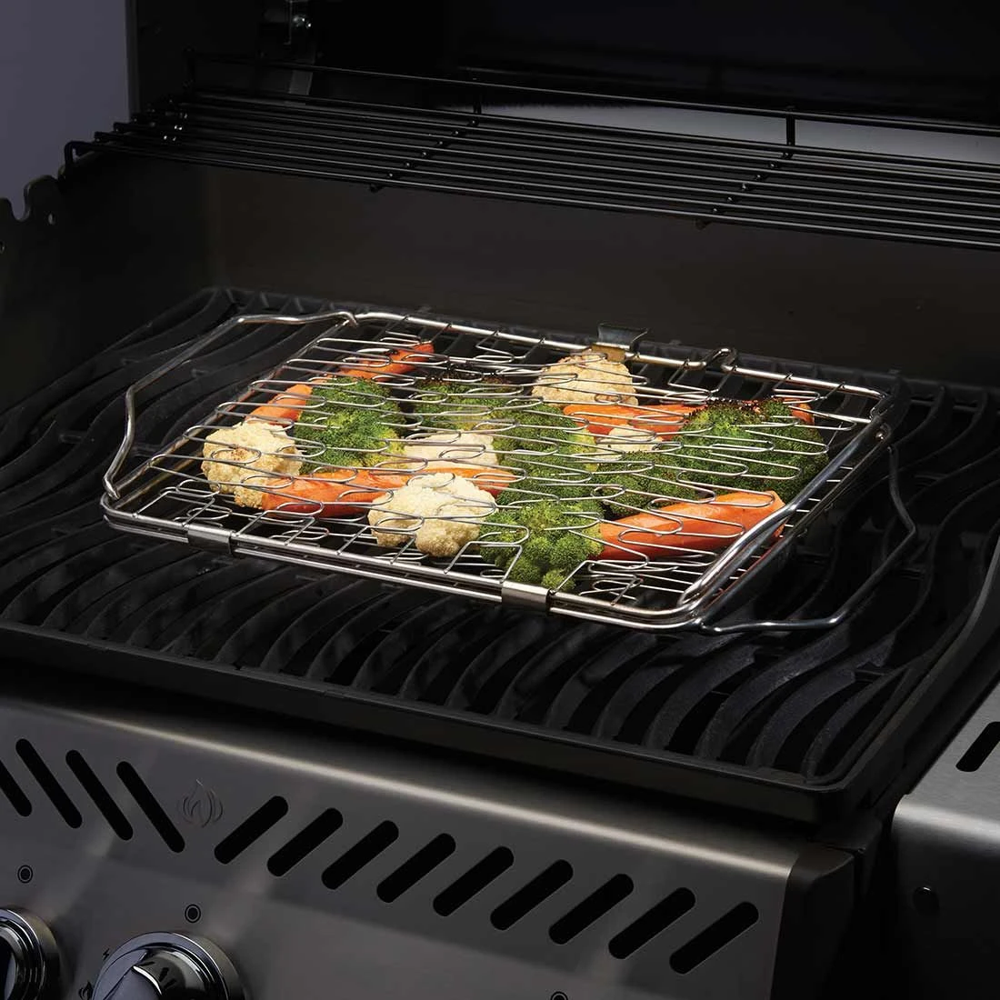 Napoleon® Halter mit flexibler Federmechanik für Elastizität. Hält Speisen zwischen den zwei Seiten fest und ist exzellent für die Zubereitung von Lachs, Gemüse etc. geeignet. Aufgrund der Bügel an beiden Seiten ist indirektes Grillen möglich. Spülmaschinenfest. Passend für fast alle Grillmodelle (40,1 cm x 26,2 cm x 8,6 cm).