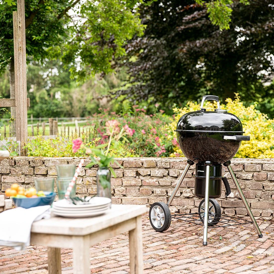 Der Grillrost ist aus Edelstahl gefertigt, was ihn widerstandsfähig und pflegeleicht macht. Auch eine Besonderheit sind die wetterfesten, gummierten Räder, die wie seine vier Beine für einen stabilen Stand sorgen. Im Deckel verbirgt sich ein Haken, mit dem Sie diesen leicht aufhängen können.