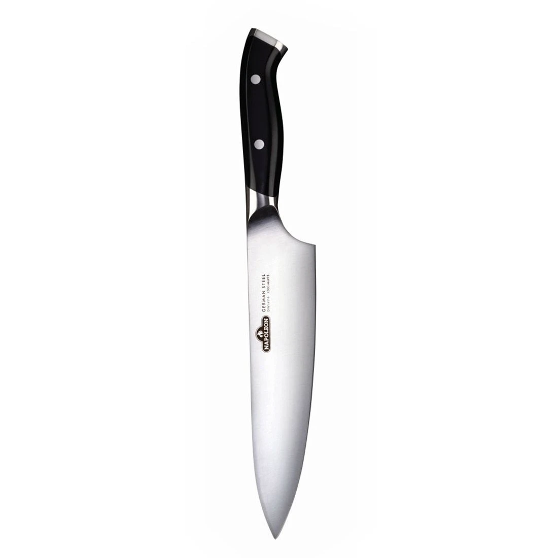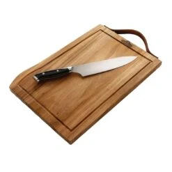 Napoleon® Schneidebrett aus Akazienholz und mit einem Griff aus echtem Leder. Tropfkante für saubere und schnelle Lebensmittelzubereitung und einfache Reinigung. Einschließlich PRO Chefkochmesser.