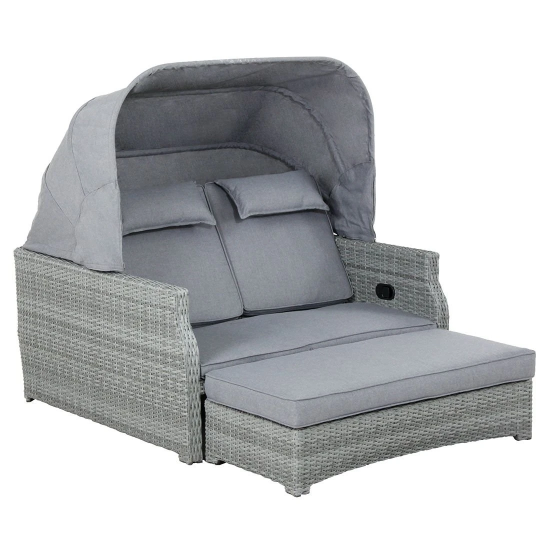 Der Bezug des Daybeds ist aus Polyester gefertigt. Für eine längere Haltbarkeit empfehlen wir bei stärkerem oder lang anhaltendem Regen die abnehmbaren Kissen im Innenraum zu lagern.
