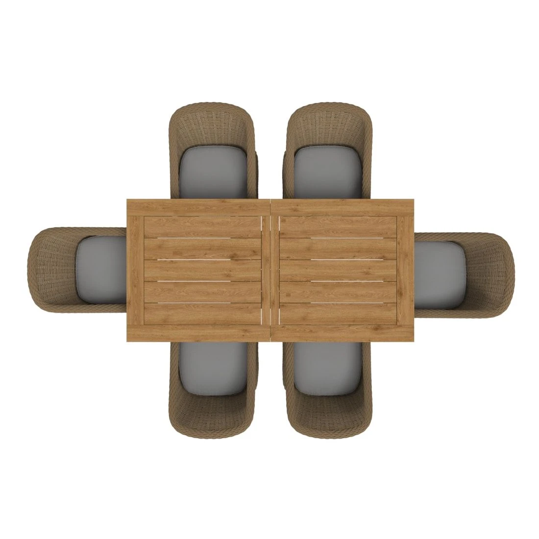 Zum Lieferumfang des Sets gehört auch ein praktischer Tisch. Die Gebrauchsspuren in der Tischplatte sind Teil des Designs der Tischplatte. Denn diese ist aus wiederverwertetem Teak gearbeitet, das zuvor aus alten Hütten und Booten gewonnen wurde. Bei der Aufarbeitung werden dann Einkerbungen, Nagellöcher und Co. bewusst erhalten. Jede Tischplatte und damit jeder Gartentisch ist also ein Unikat. Mit der rechteckigen Form lässt sich der Tisch platzsparend in Ecken oder an Häuserwänden aufstellen.
