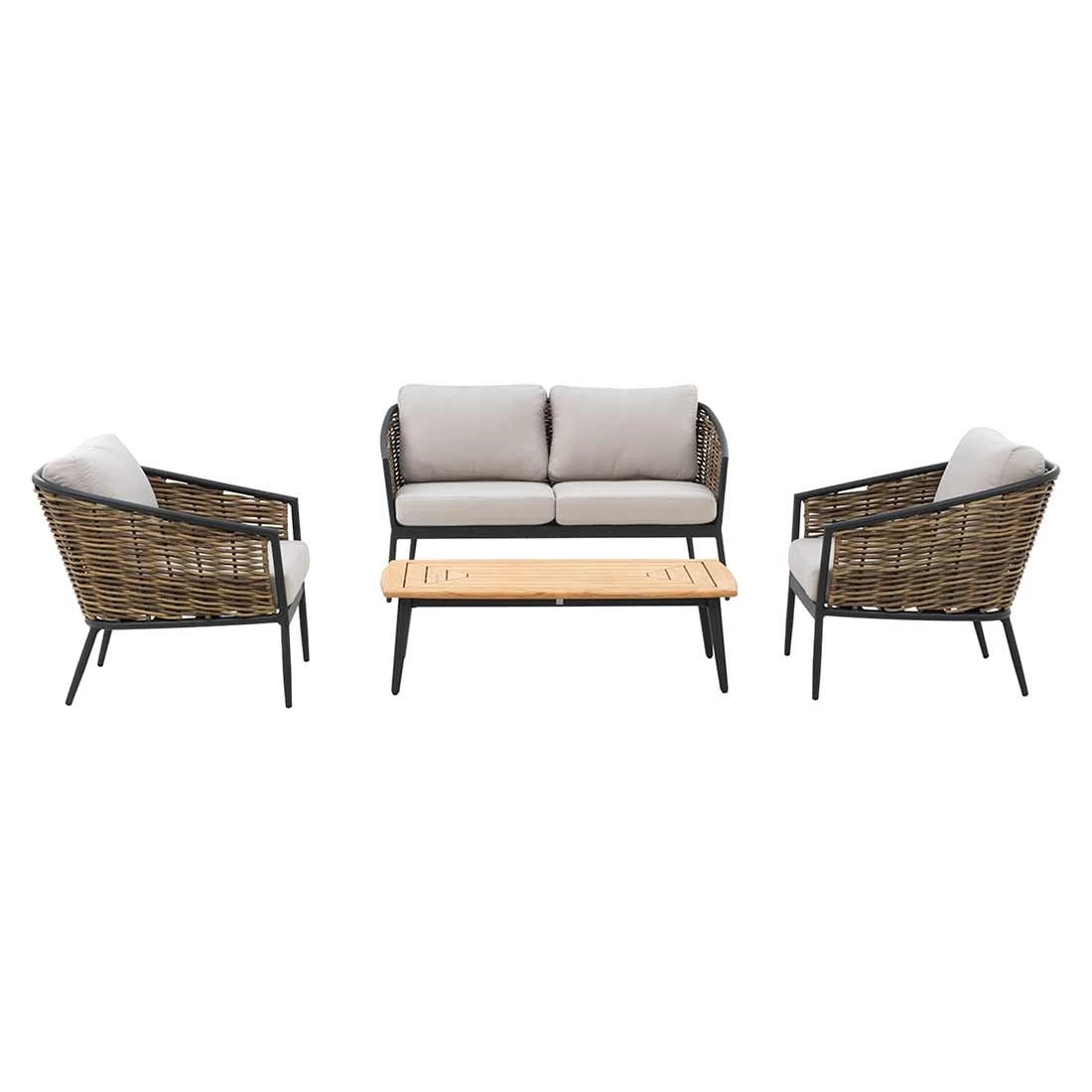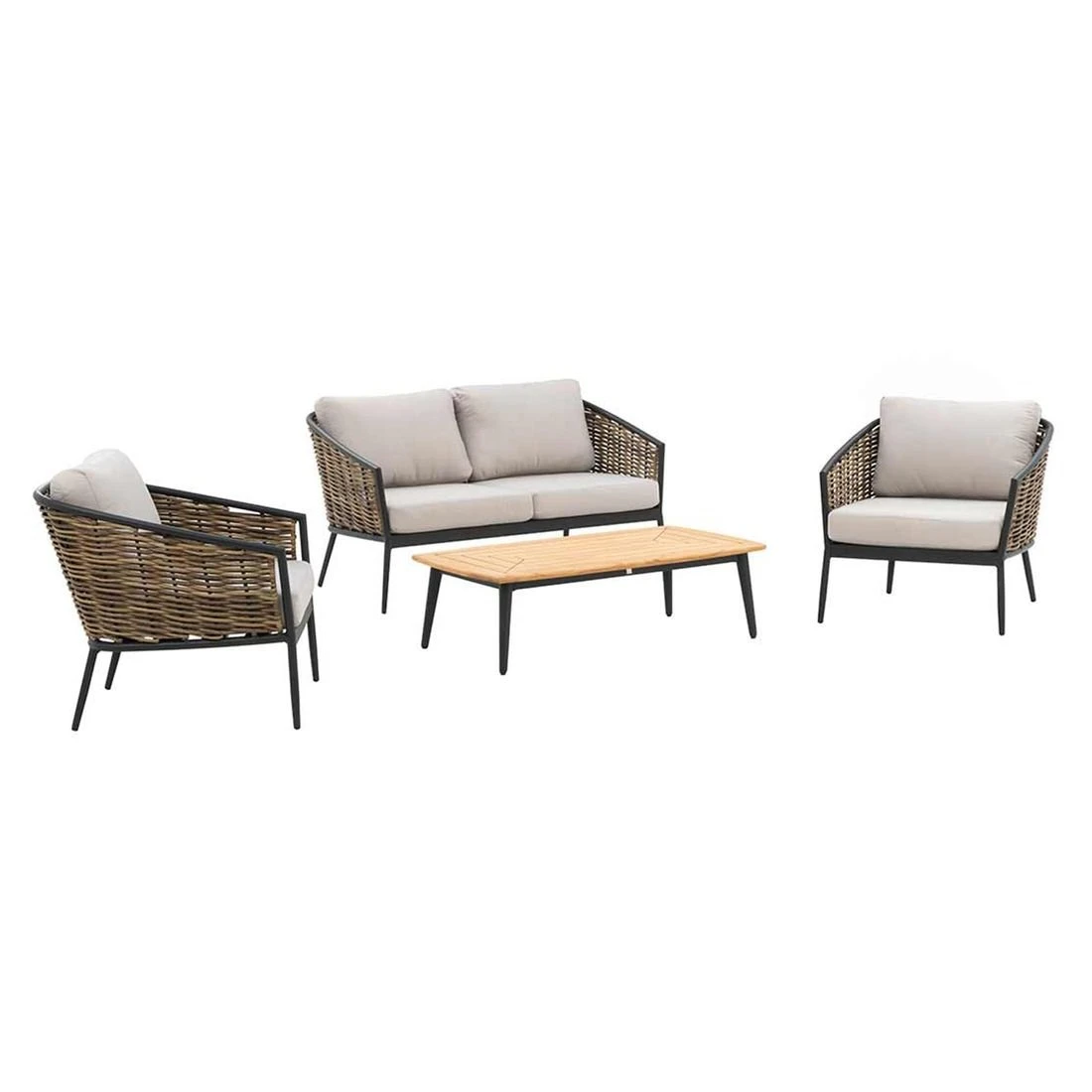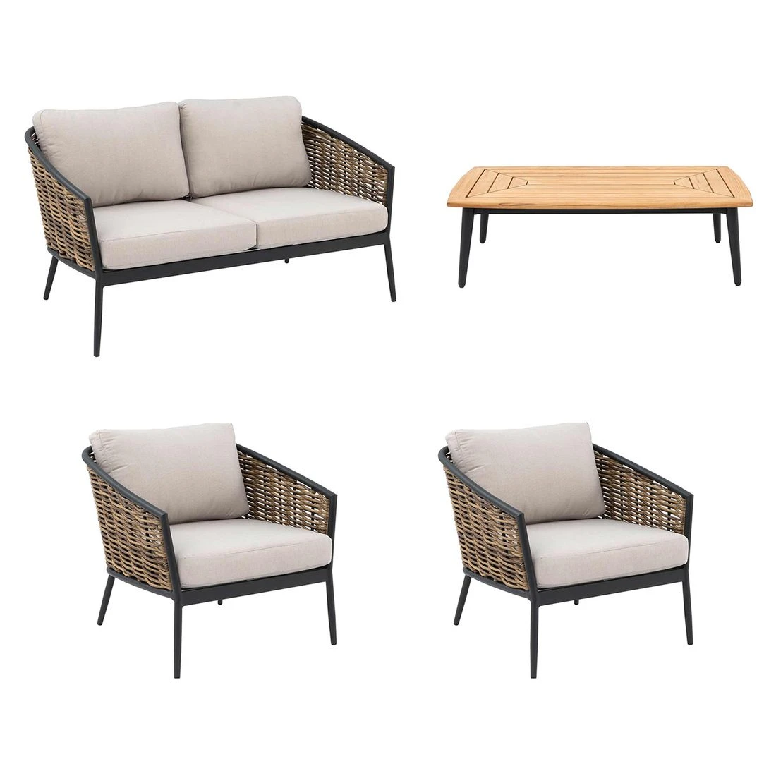 Als Material des Gestells hat der Hersteller hochwertiges Aluminium gewählt. Optisch begeistert das Gestell in der Farbe Anthrazit. Für die Bespannung der Sitzfläche wird hochwertiges Rope verwendet. Es zeichnet sich durch eine hohe Robustheit. Die Kissen sind mit dem Outdoorstoff Spunpolyester bezogen. Dieses Material ist besonders wetterfest und UV-beständig. Zugleich bietet der Stoff eine angenehme Haptik und Komfort. Die Farbe des Bezugs ist Ivory. Die Platte des Tisches ist aus hochwertigem Teak hergestellt. Durch den sehr hohen natürlichen Ölanteil ist sie bereits von Haus aus einwandfrei vor Witterungseinflüssen geschützt. Die Tischplatte ist Natur.