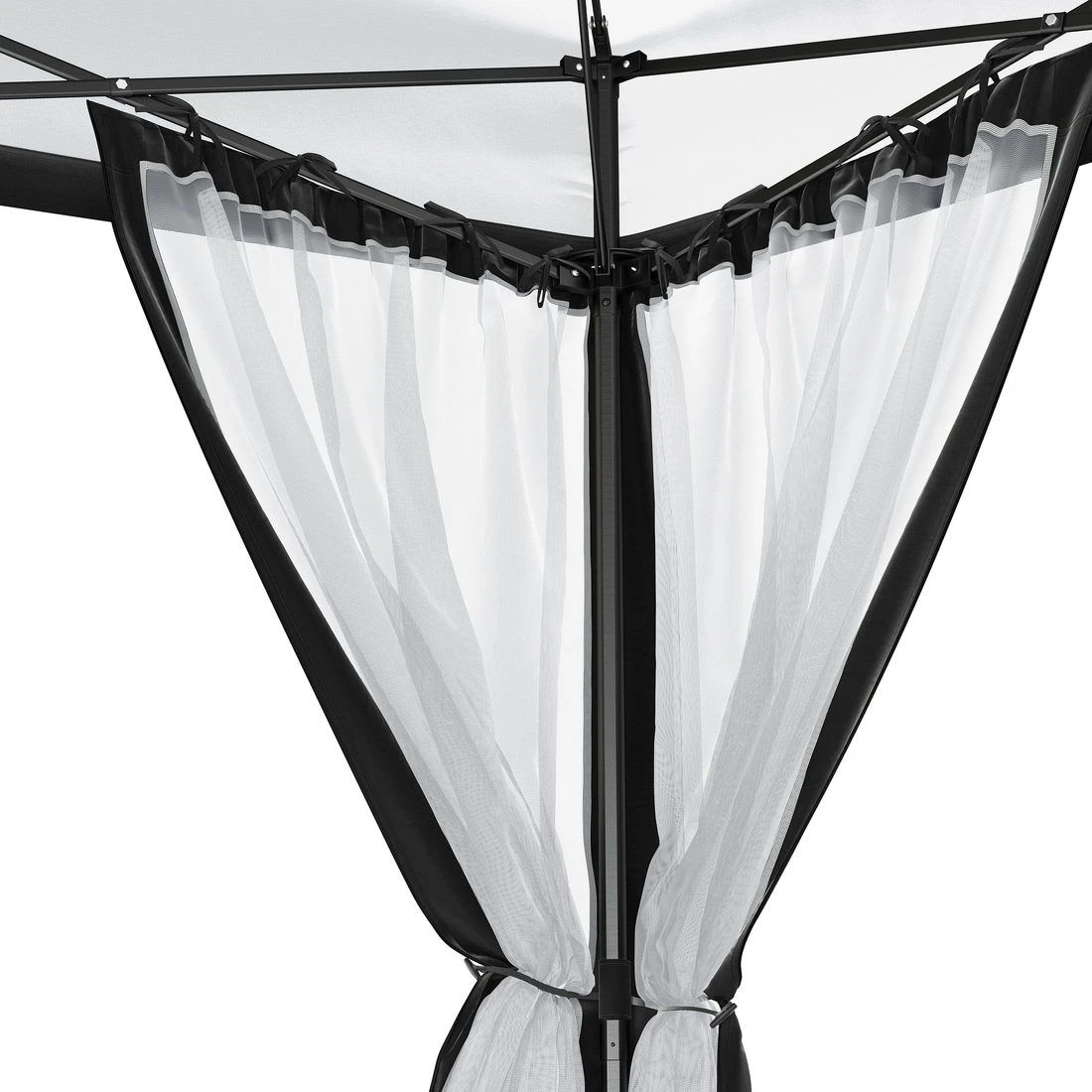 Möchten Sie sich vor unliebsamen Blicken der Nachbarn etwas schützen, lösen Sie einfach das Fixierband an den Eckpfosten und ziehen die semitransparenten Vorhänge zu. In den Abendstunden sorgen die Vorhänge zudem dafür, dass die Kälte nicht so schnell in den Pavillon ziehen kann.