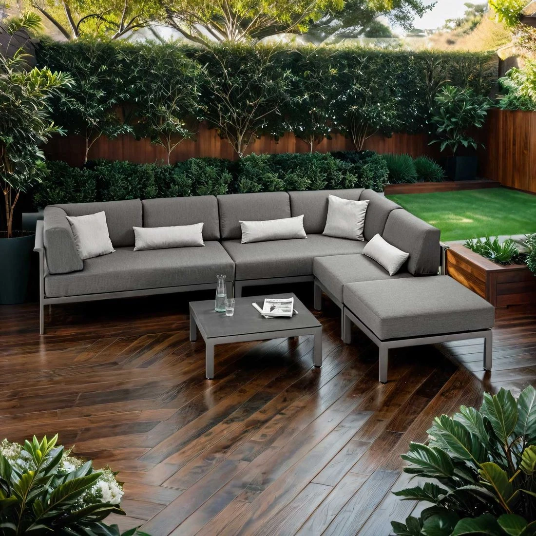 Als Material des Gestells hat der Hersteller hochwertiges Aluminium gewählt. Der Bezug der Ecklounge ist aus Polyacryl gefertigt. Dieses Material begeistert mit einer hohen Witterungsbeständigkeit. Regen kann dem robusten Outdoor-Stoff kaum etwas anhaben. Die robuste Tischplatte aus Keramik ist nicht so schwergewichtig wie Naturstein, sorgt allerdings ebenso für windsicheren Halt im heimischen Garten. Für ein perfekt stimmiges Gesamtbild sorgt die einheitliche Farbgebung in stilvollem Anthrazit.
