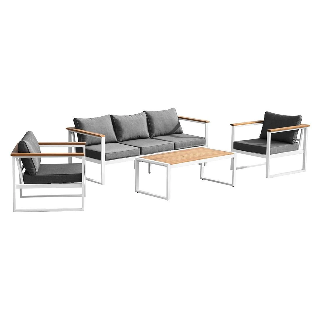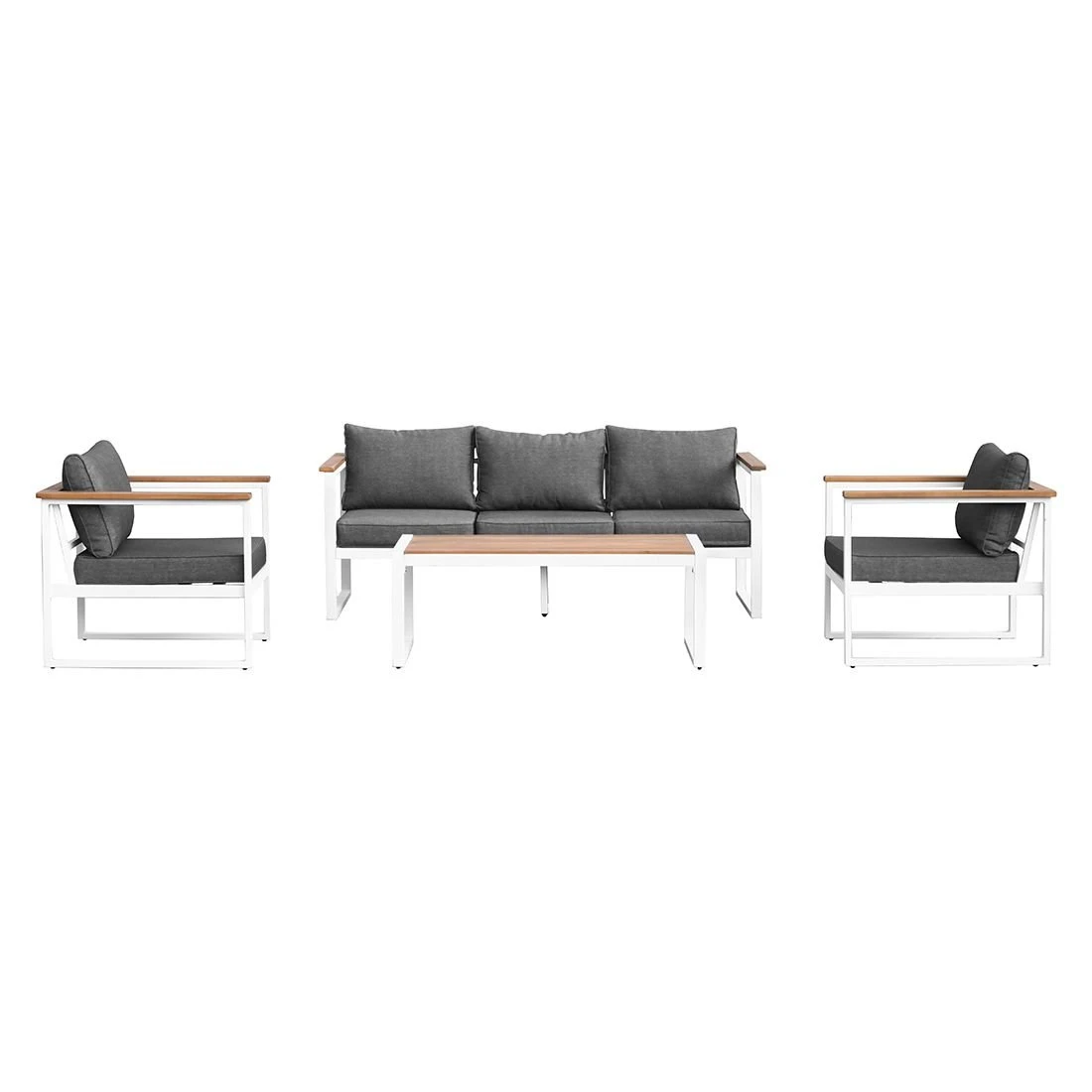 Als Gestellmaterial hat der Hersteller hochwertiges Aluminium gewählt. Optisch begeistert das Gestell in der Farbe Weiß. Die Sitz- und Rückenfläche ist mit dem Outdoorstoff Spun Poly bezogen. Dieses Material ist besonders wetterfest und UV-beständig. Zugleich bietet der Stoff eine angenehme Haptik und Komfort. Die Farbe des Bezugs ist Dunkelgrau. Die Tischplatte wird aus Eukalyptus gefertigt und bringt ein elegantes Flair auf Ihre Terrasse. Farblich überzeugt die Tischplatte in Teak-Look.